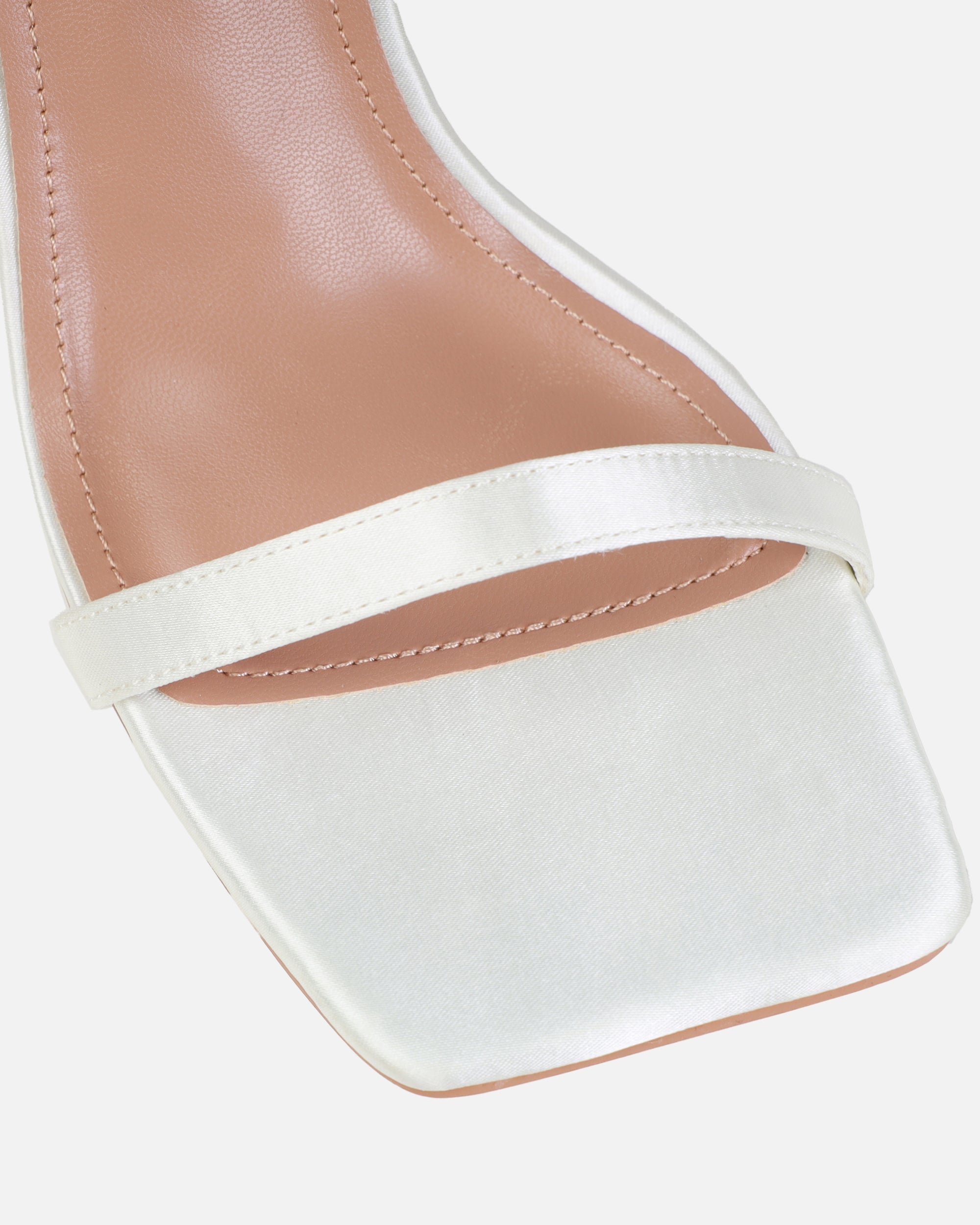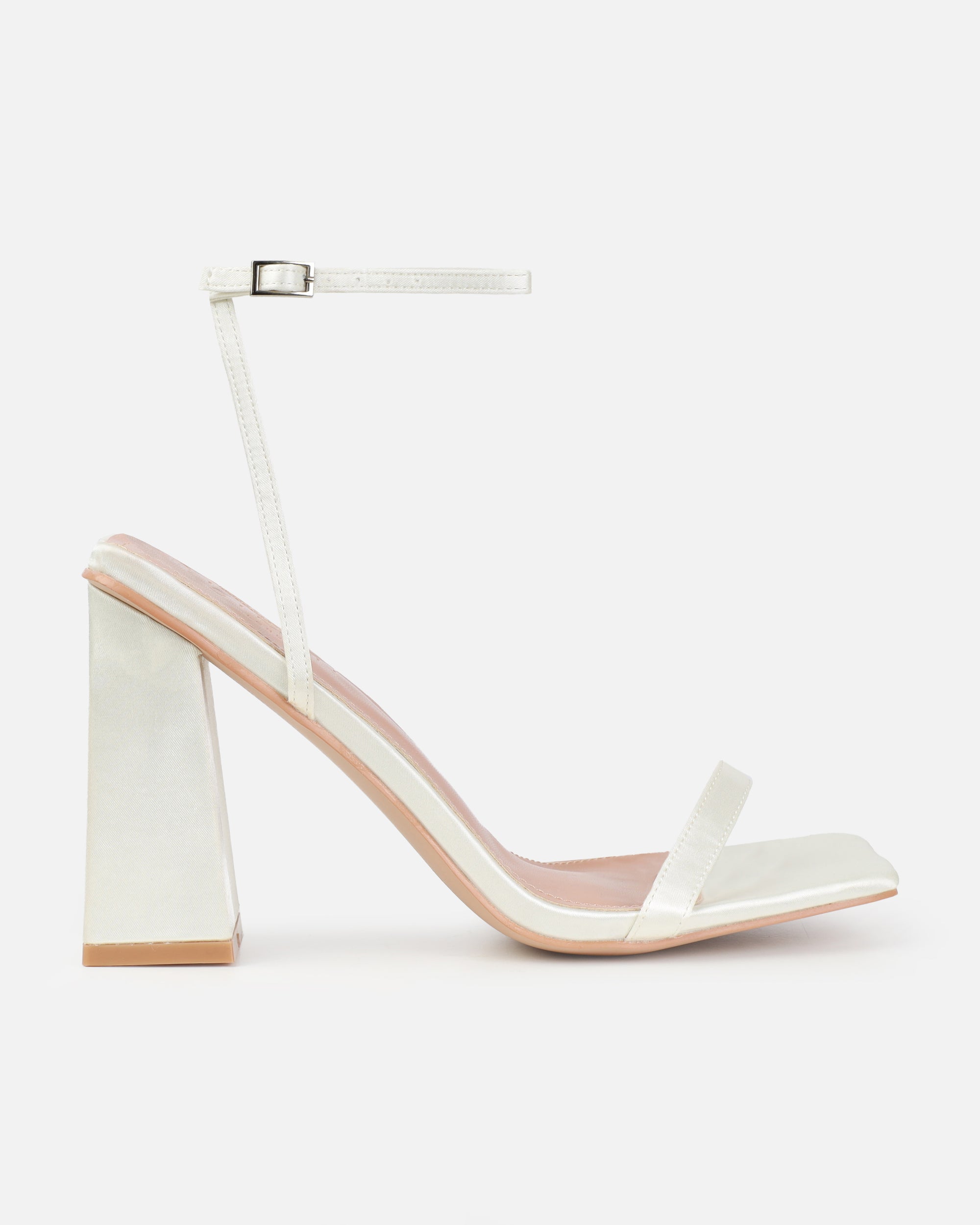 The perfect favor for your wedding inspired looks. Featuring a square toe, front strap, ankle buckle strap and a block heel. Wear with satin midi dresses.