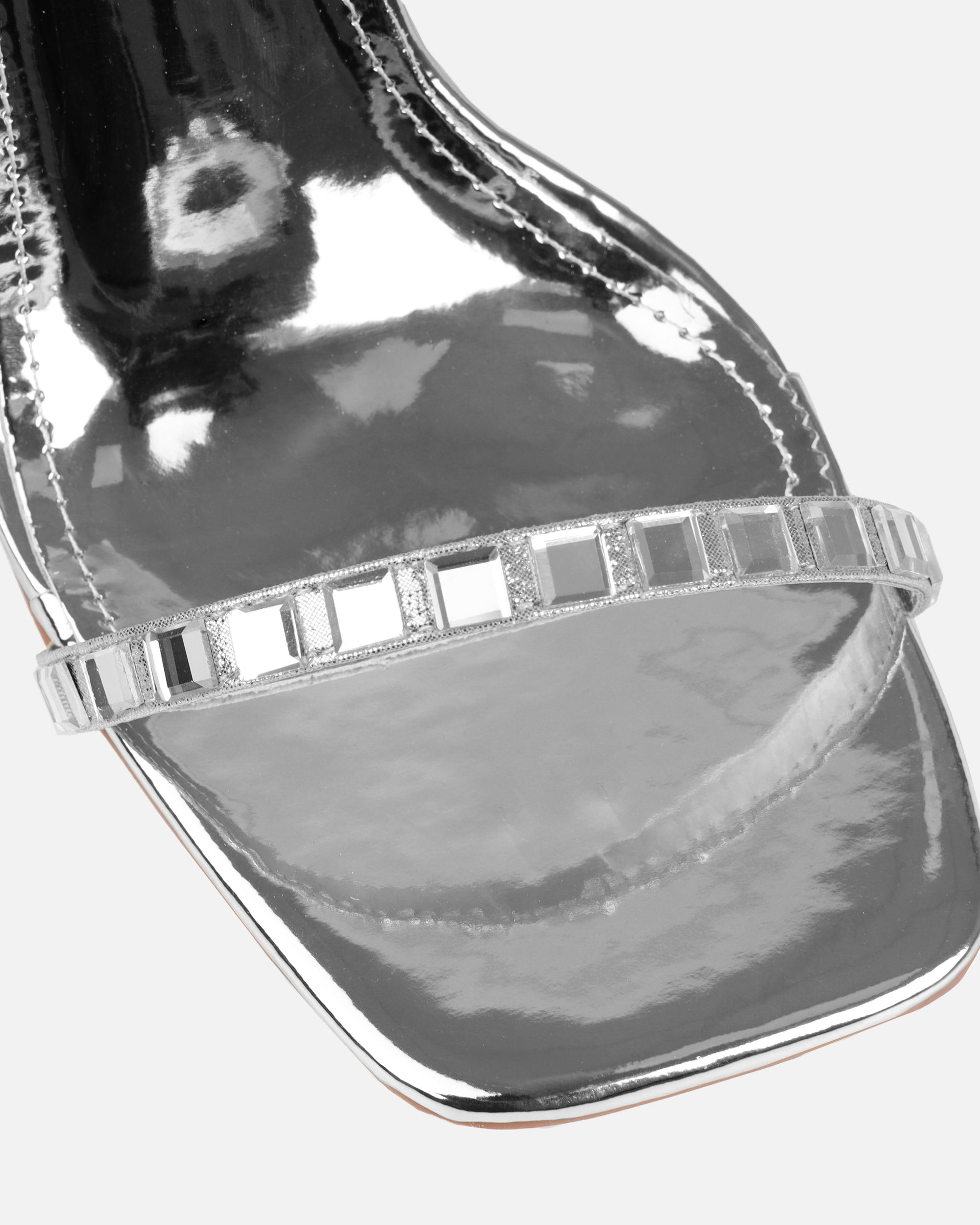 We're loving these gem strappy heels. Featuring a square toe, gem front strap, clear ankle buckle strap and a gem stiletto heel. Wear these on your next dressy occasion.