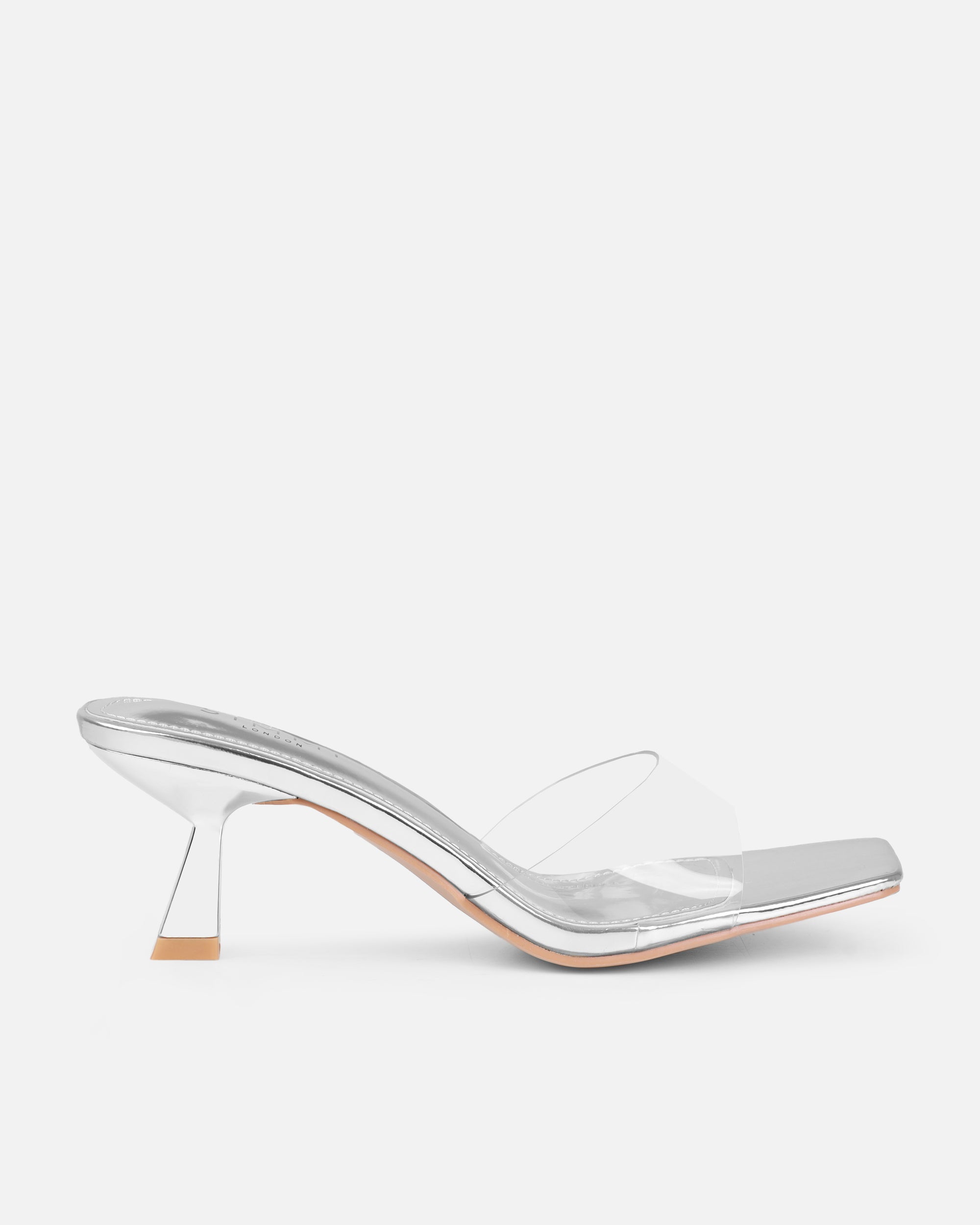 Step out in these mid heel mules. Featuring a square toe, clear front and a mid heel. The perfect mules to wear from day-to-night.