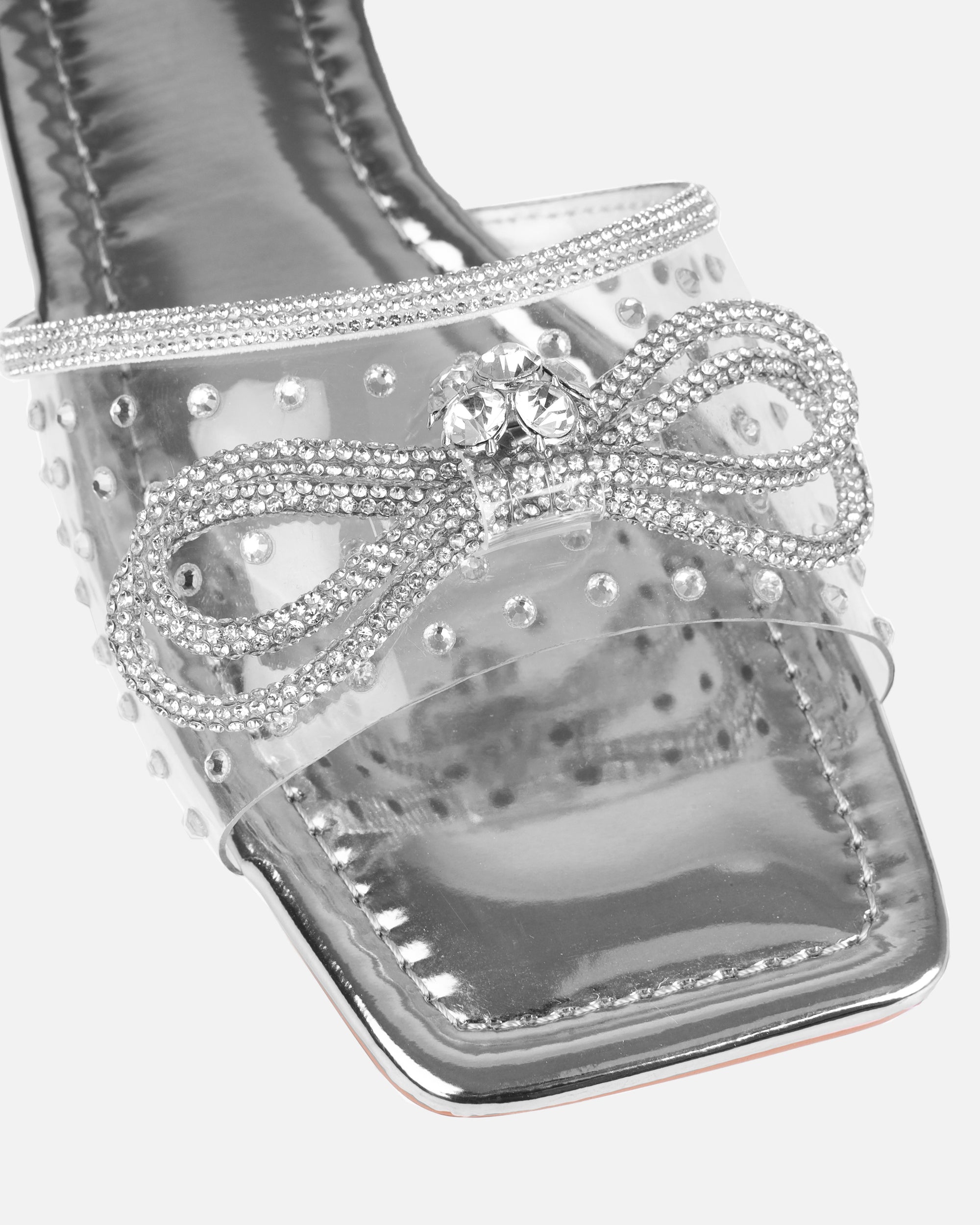 It's always sparkle season at SIMMI and these flats are giving us all the sparkles. Featuring a square toe, diamantes and diamante bow trim on a clear front strap. You'll be wearing these for those dressy occasions.