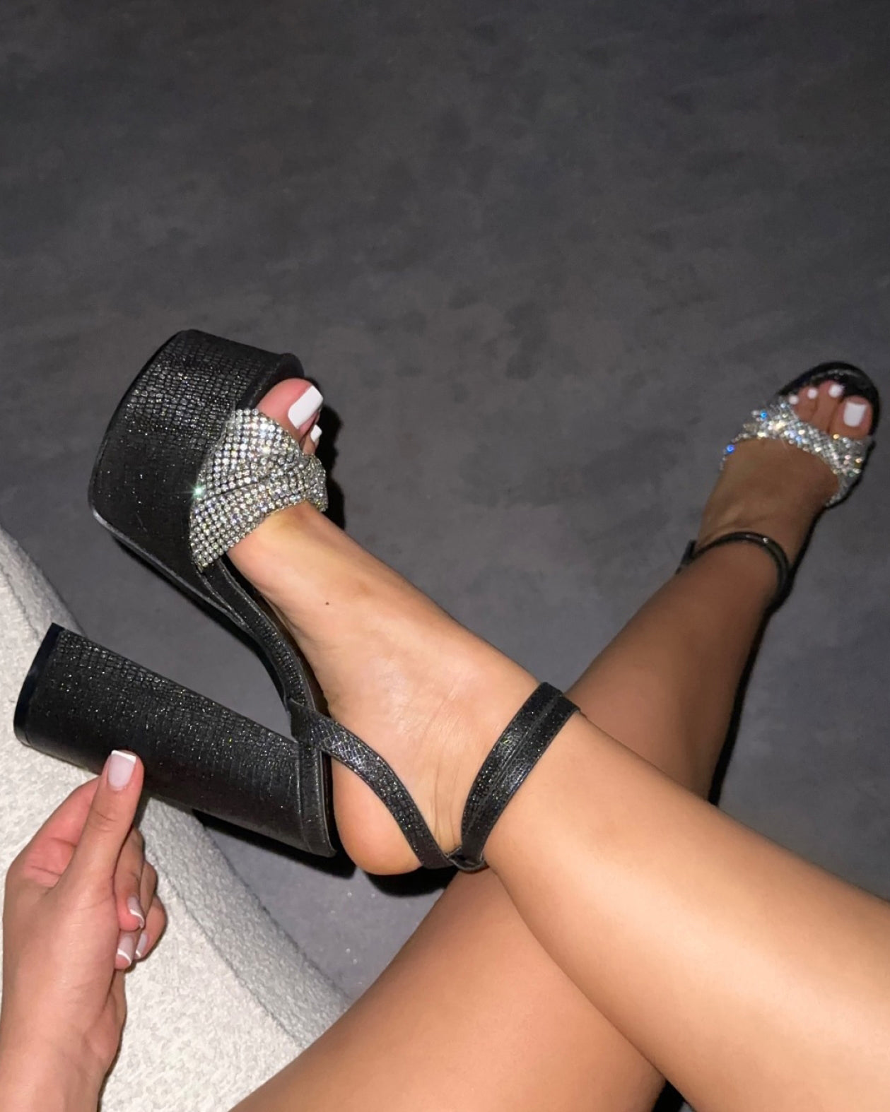 Slip into pure glamour with these black shimmer diamante platform heeled sandals. Featuring a square toe, platform, diamante front strap and a block heel. For a glamorous evening look, pair your shimmer diamante platform heeled sandals with a sleek evening dress.
