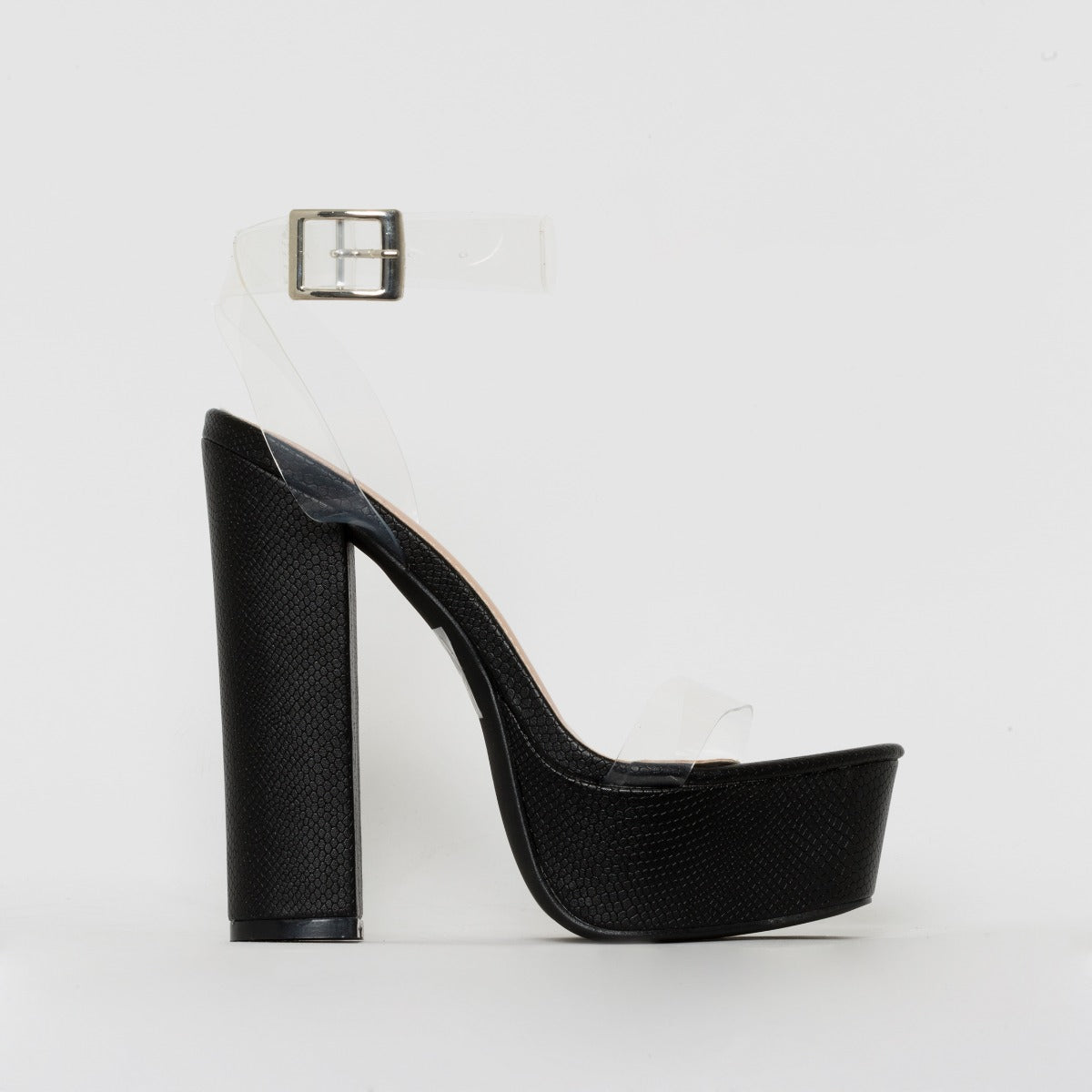 platform feels this summer. featuring a pu base, silver buckle and perspex strap. perfect for partying in comfort. let your feet be the best dressed in this season's must have.