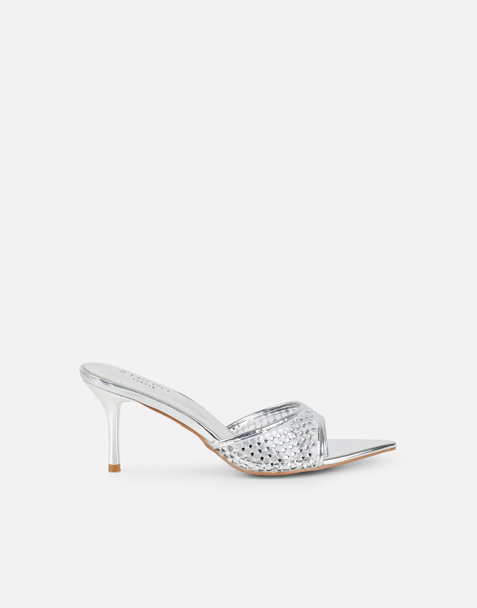 Add a touch of glamour to your look with these dazzling diamante mesh mules. Designed with a sleek pointed open toe and a subtle small heel, they perfectly balance elegance and comfort. The slip-on style makes them effortlessly chic and easy to wear, ideal for evenings out or special occasions. With their sparkling finish and graceful silhouette, these mules bring a refined yet eye-catching charm to any outfit.