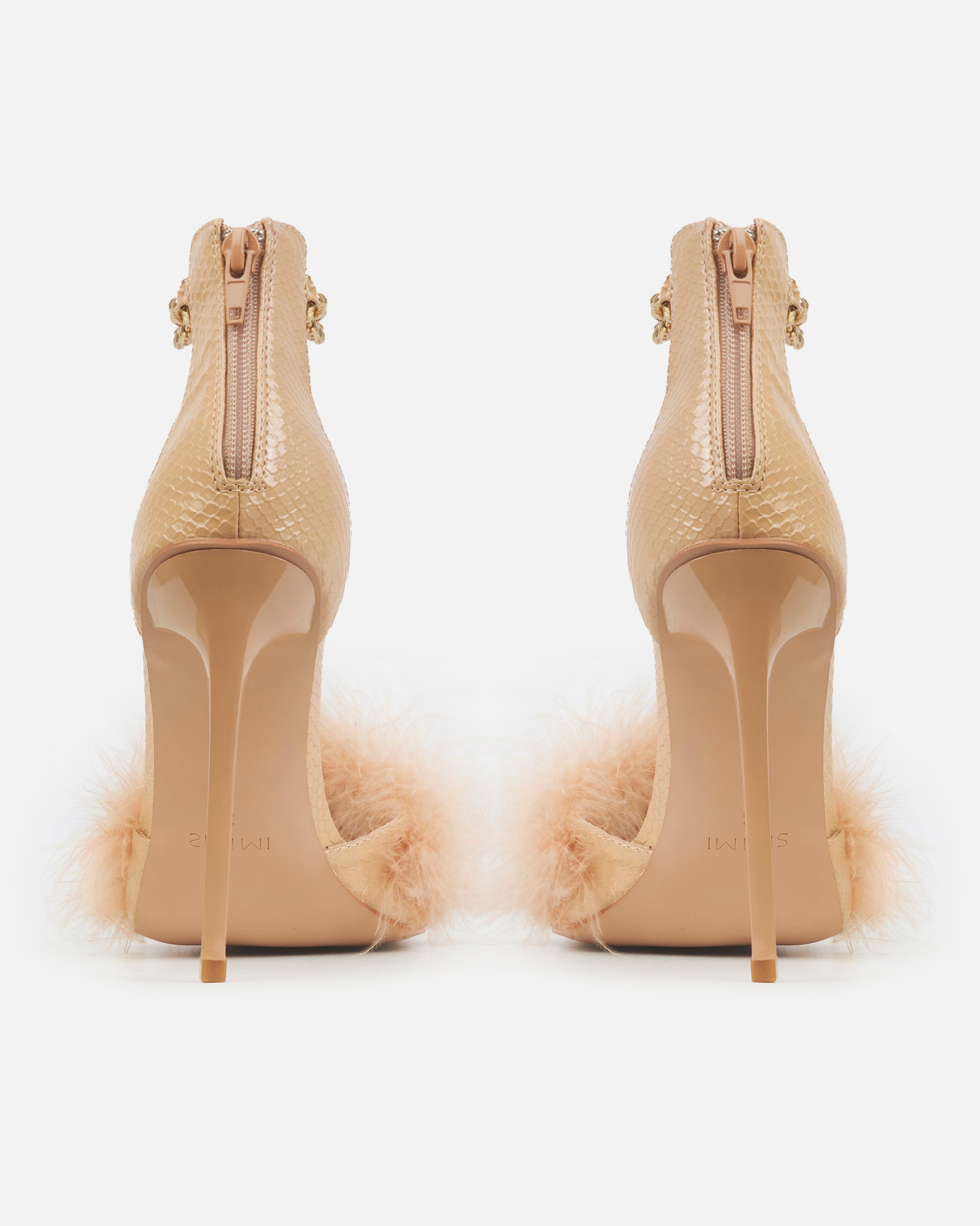 Nude Faux Snake Fluffy Heeled Sandals With Chains