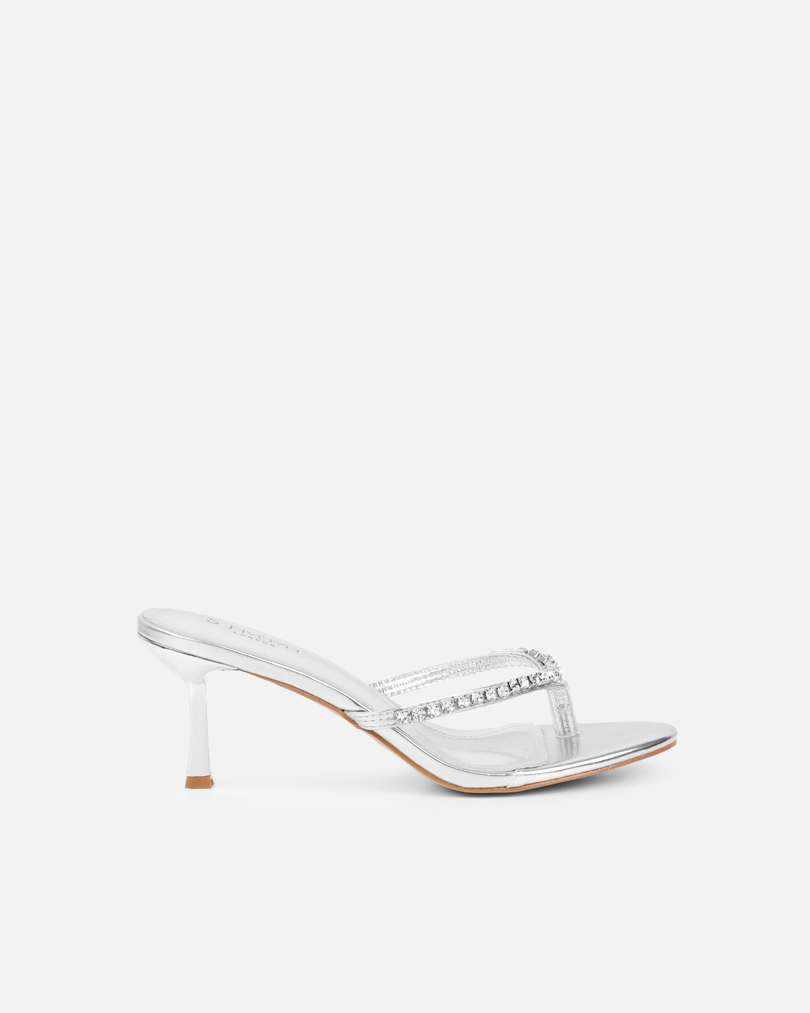 Silver Metallic Diamante Toe Thong Heeled Sandals