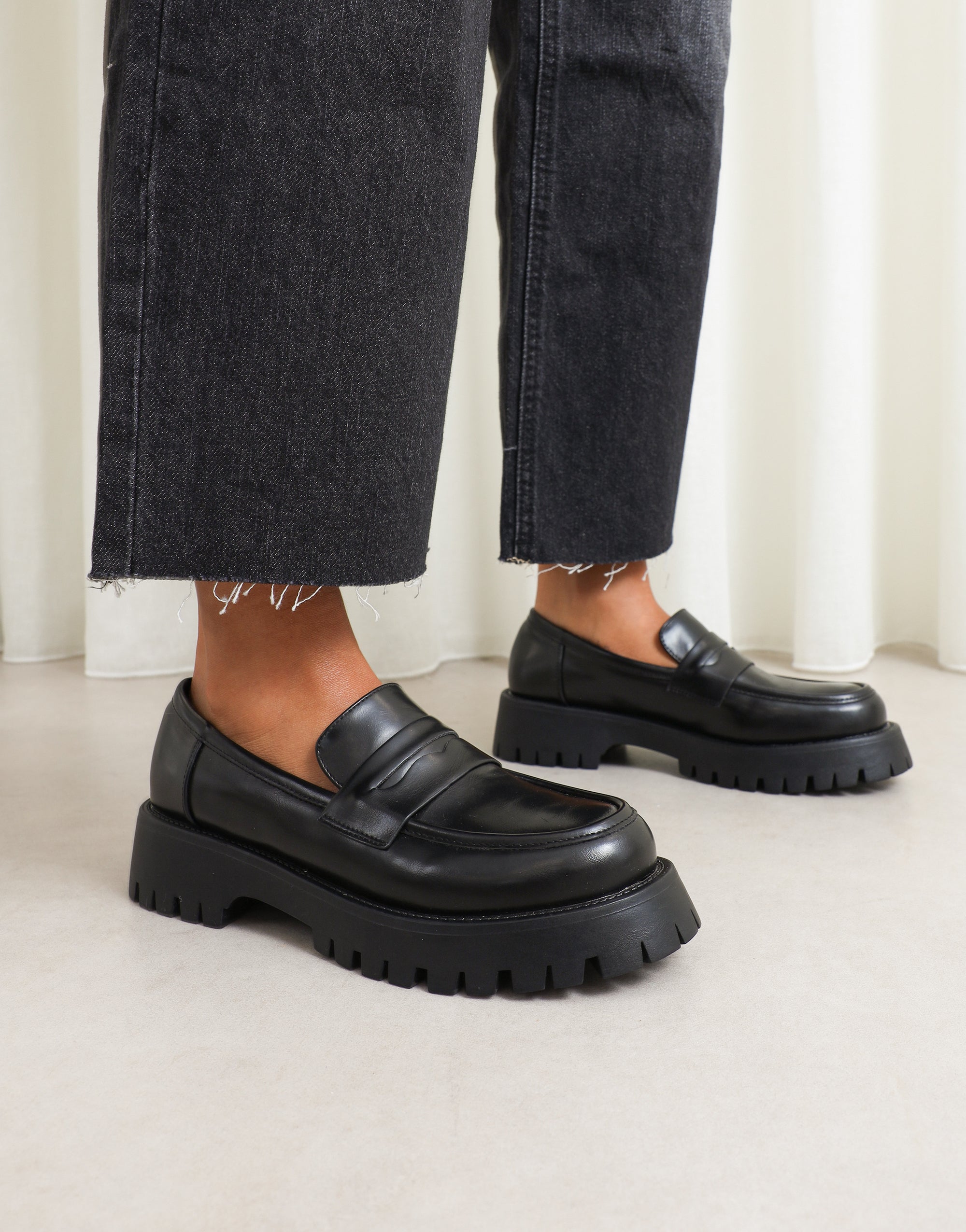 Rock your look with black faux leather penny loafers that serve serious style and sass. The chunky sole gives major attitude, perfect for strutting through your day like a boss. Pair them with your fave fit and let your shoes do the talking!