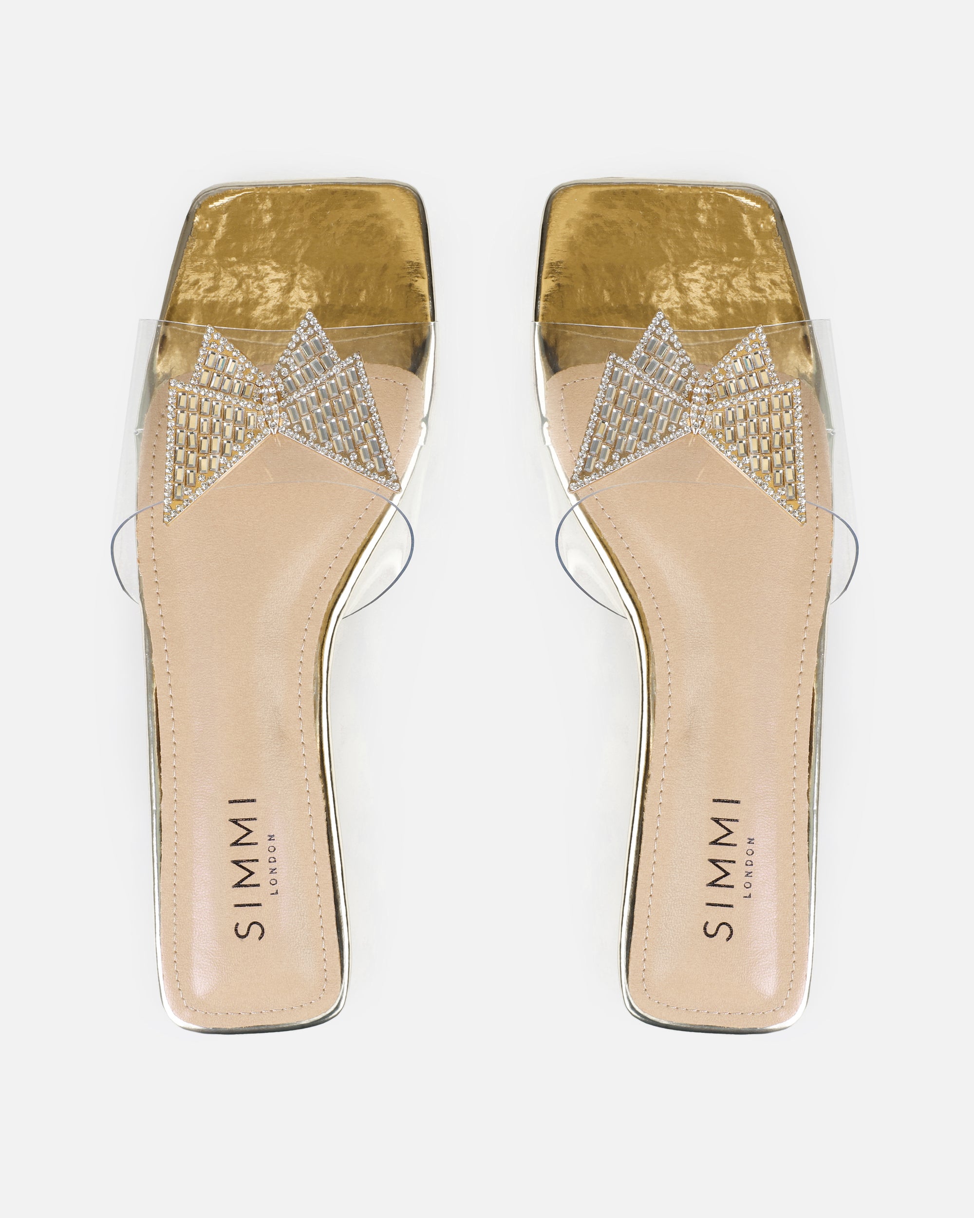 Add these flat slides to your bag! Featuring a square toe and clear front strap with diamante gem bow trim. You'll be wearing these all summer long.