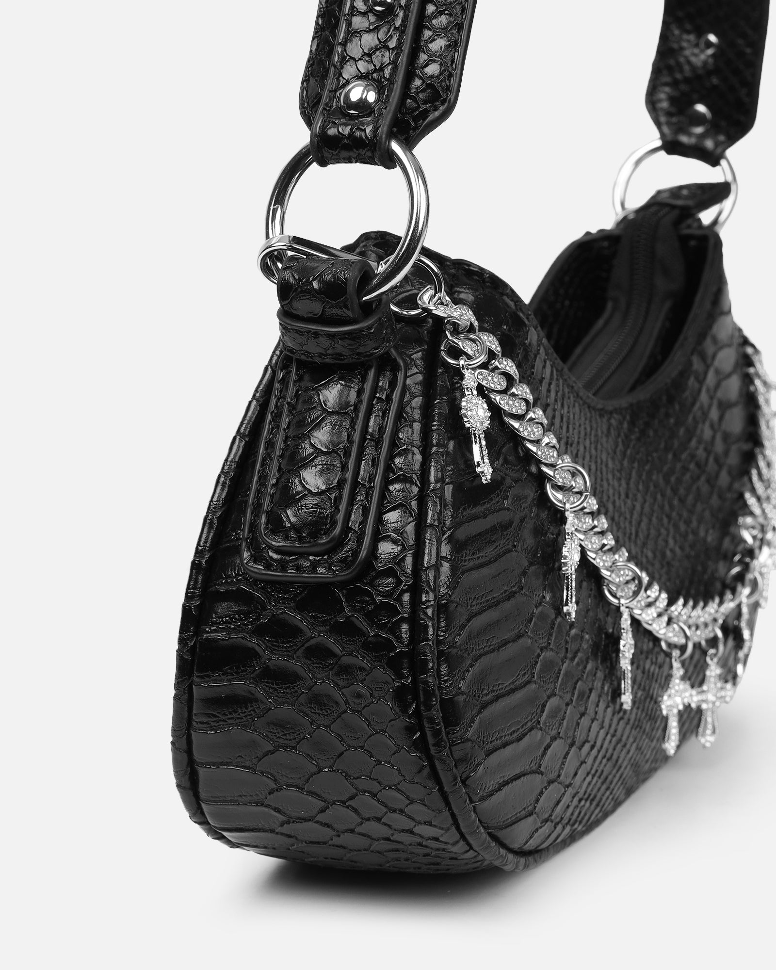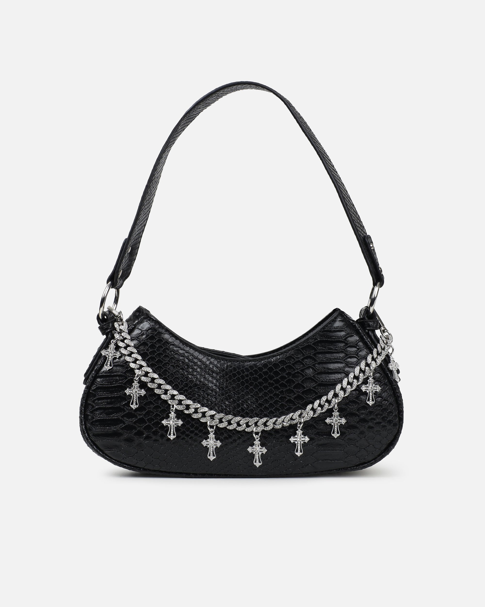 Black Snake Effect Diamante Cross Chain Shoulder Bag