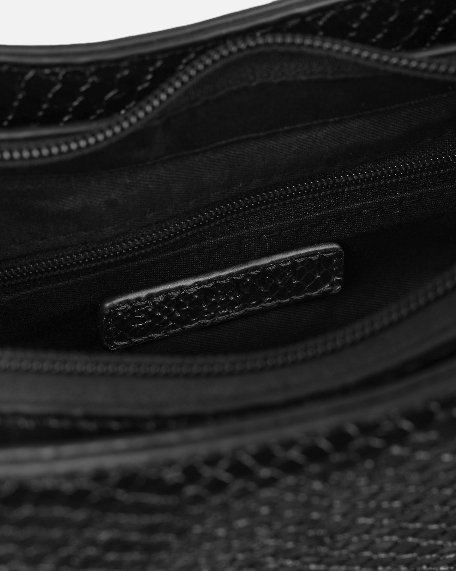 Introducing our Carmine Black Snake Effect Diamante Cross Chain Shoulder Bag. Giving us all the edgy-chic we could ask for, it's no surprise that our Carmine Shoulder Bag is at the top of the office wishlist right now. Whether it's a night out, or a lunch date with the girls, complete your look and prepare for the 'where did you get that?'s.