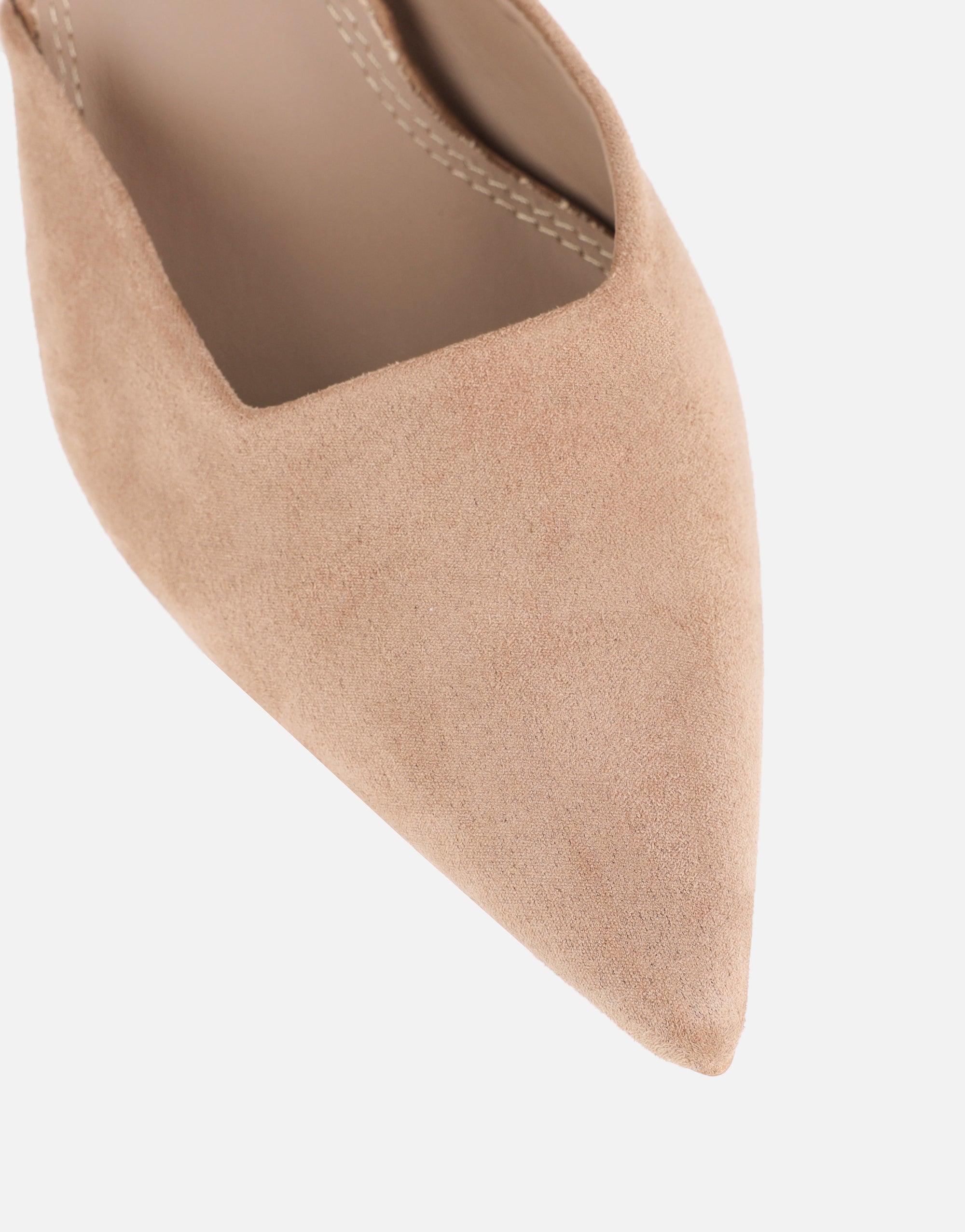Keep it chic and easy with these stone faux suede mules. The slip-on design and low kitten heel make them perfect for everyday wear with just the right amount of lift. Pair them with jeans, skirts, or dresses for a laid-back yet stylish vibe.