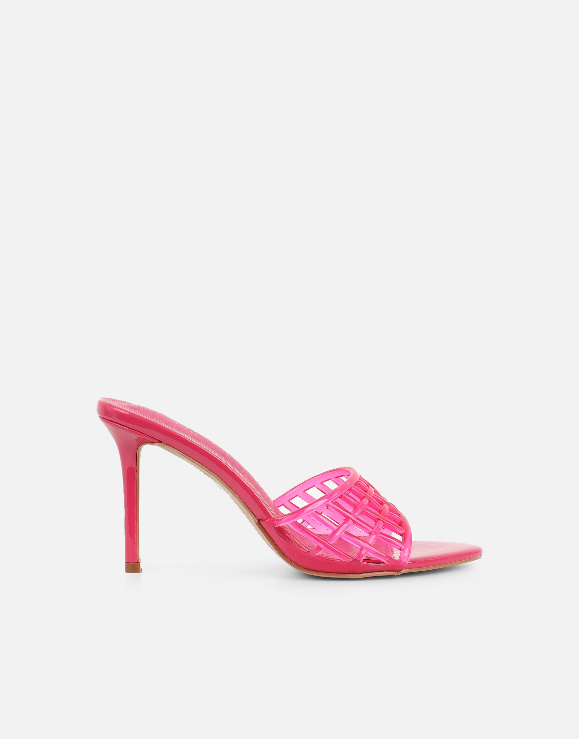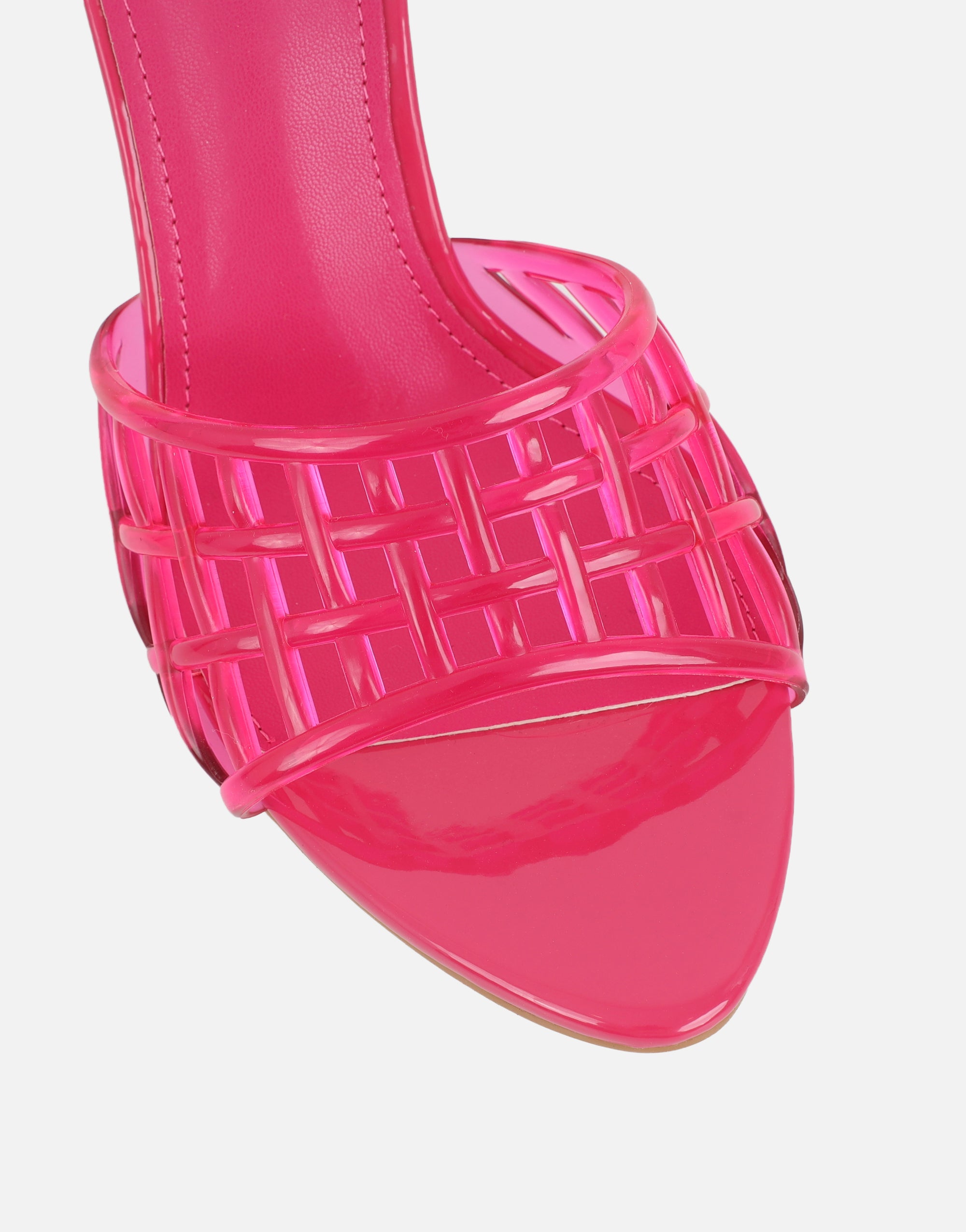 The statement of the season. These jelly high-heeled mules bring summer’s must-have trend to life. Designed with a glossy patent finish and a matching woven jelly strap for a seamless, tonal look.