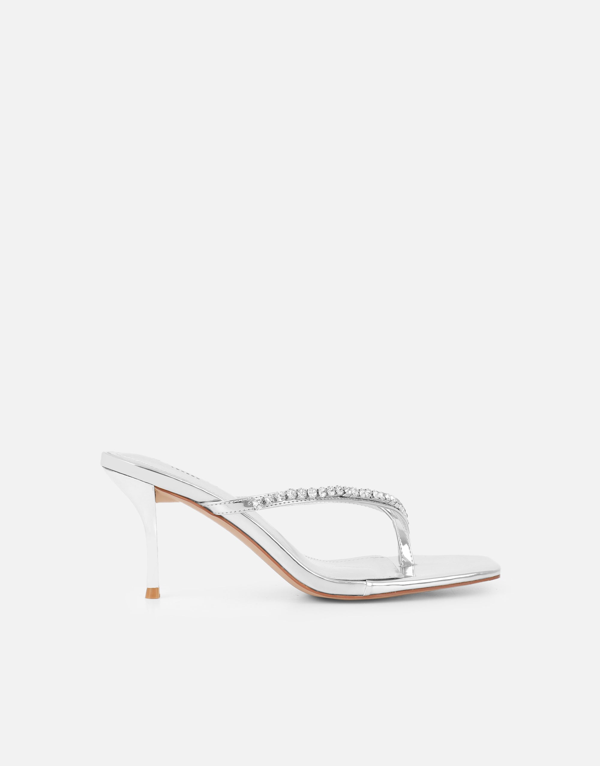 Designed to elevate every step, these diamante toe-post mules bring effortless glamour to everyday dressing. Featuring a sleek square toe and a refined mid heel, they strike the perfect balance between comfort and statement style. The slip-on design makes them easy to wear, while the shimmering diamante detail adds a touch of modern elegance.