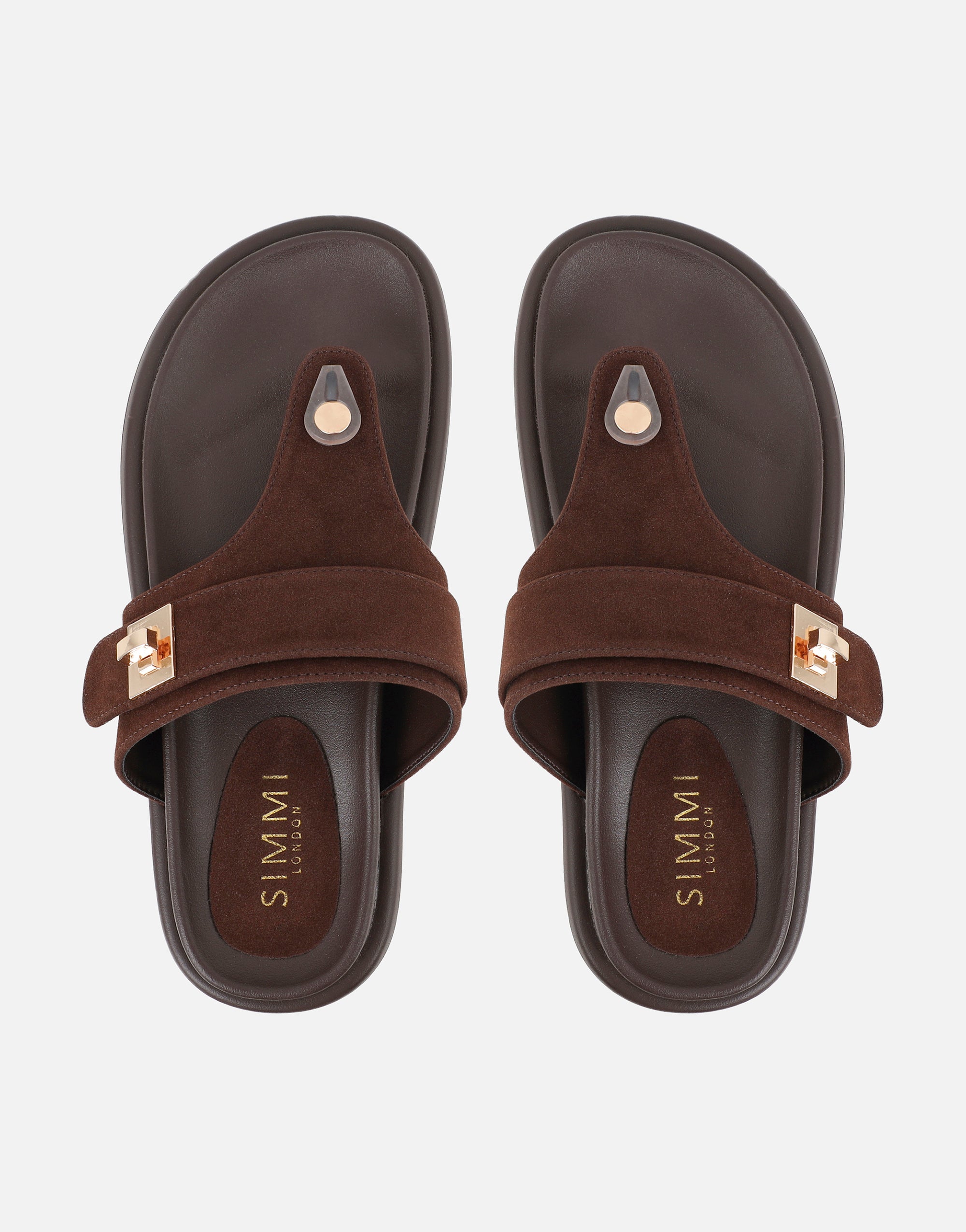Upgrade your everyday look with these brown suede sandals, bringing a warm, luxe feel to any outfit. Designed with a toe post silhouette, chunky sole, and gold hardware accents, they offer the perfect balance of comfort and statement style.