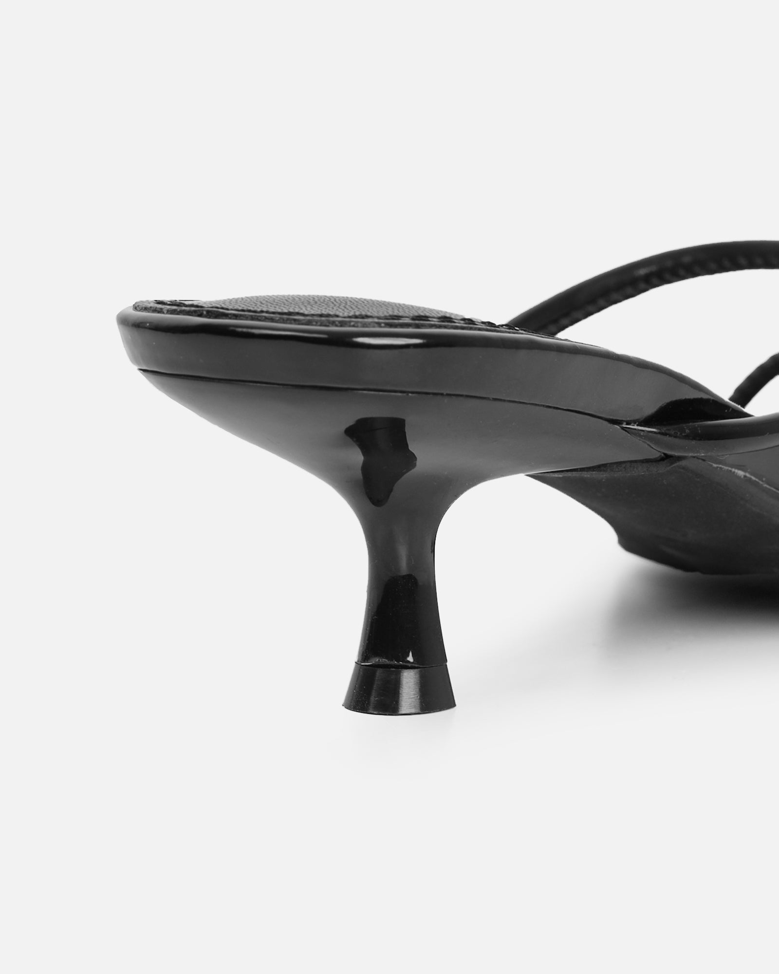 Meet your next go-to statement heel! The Haylen Black Patent Knotted Mules are here to elevate your style with a sleek, patent finish and minimalistic design. Featuring a chic kitten heel, delicate strap detailing, and a contemporary square toe, they add a touch of sophistication to any outfit. Whether you're dressing up for date night or dancing the night away, these kitten heeled sandals are the perfect blend of elegance and comfort—your ultimate party-ready pair!