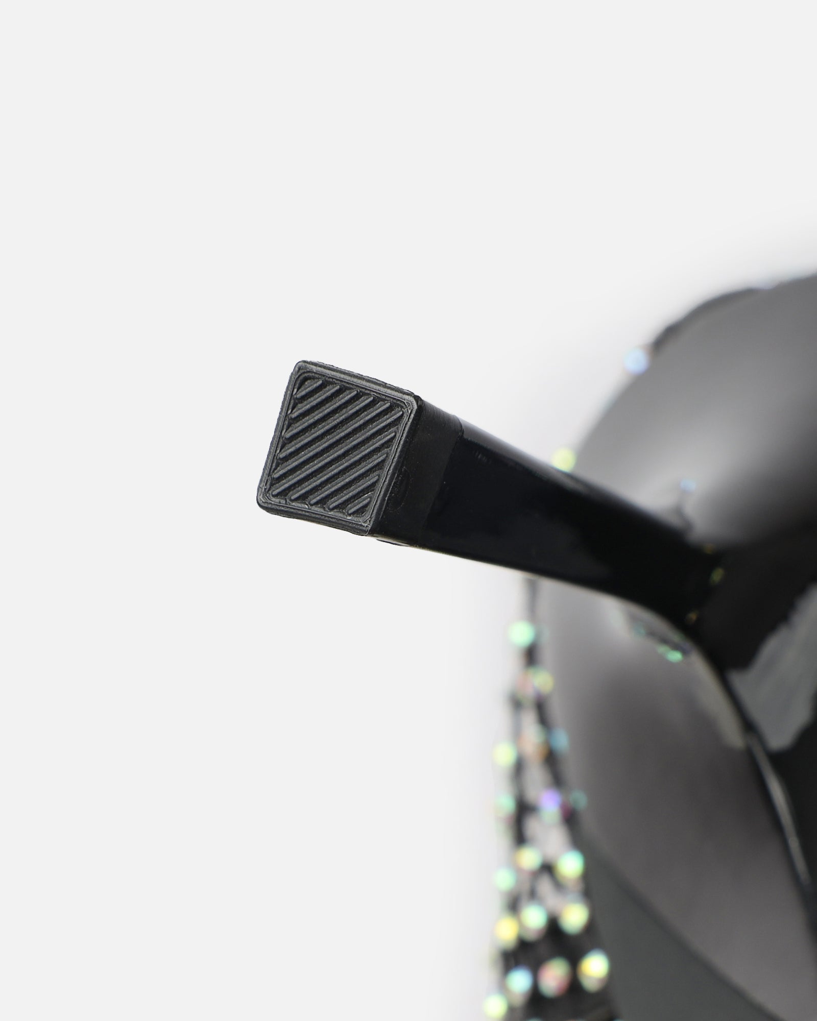 Step into the party season with our black diamante fishnet mid heels. Featuring fishnet mesh, diamante detail and a stiletto heel. These black diamante fishnet mid heels are a dazzling choice for a night of glamour and celebration.