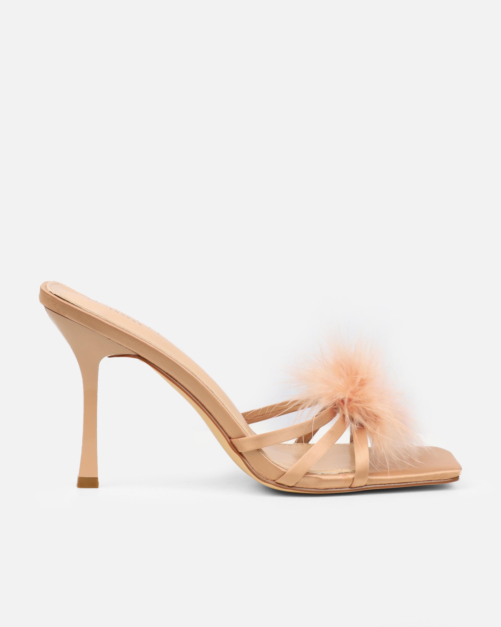 Transform your outfit instantly with these nude satin fluffy mules. Featuring a fluffy front and a square toe. These adorable nude satin fluffy mules are perfect for a fun and flirty touch to any outfit.