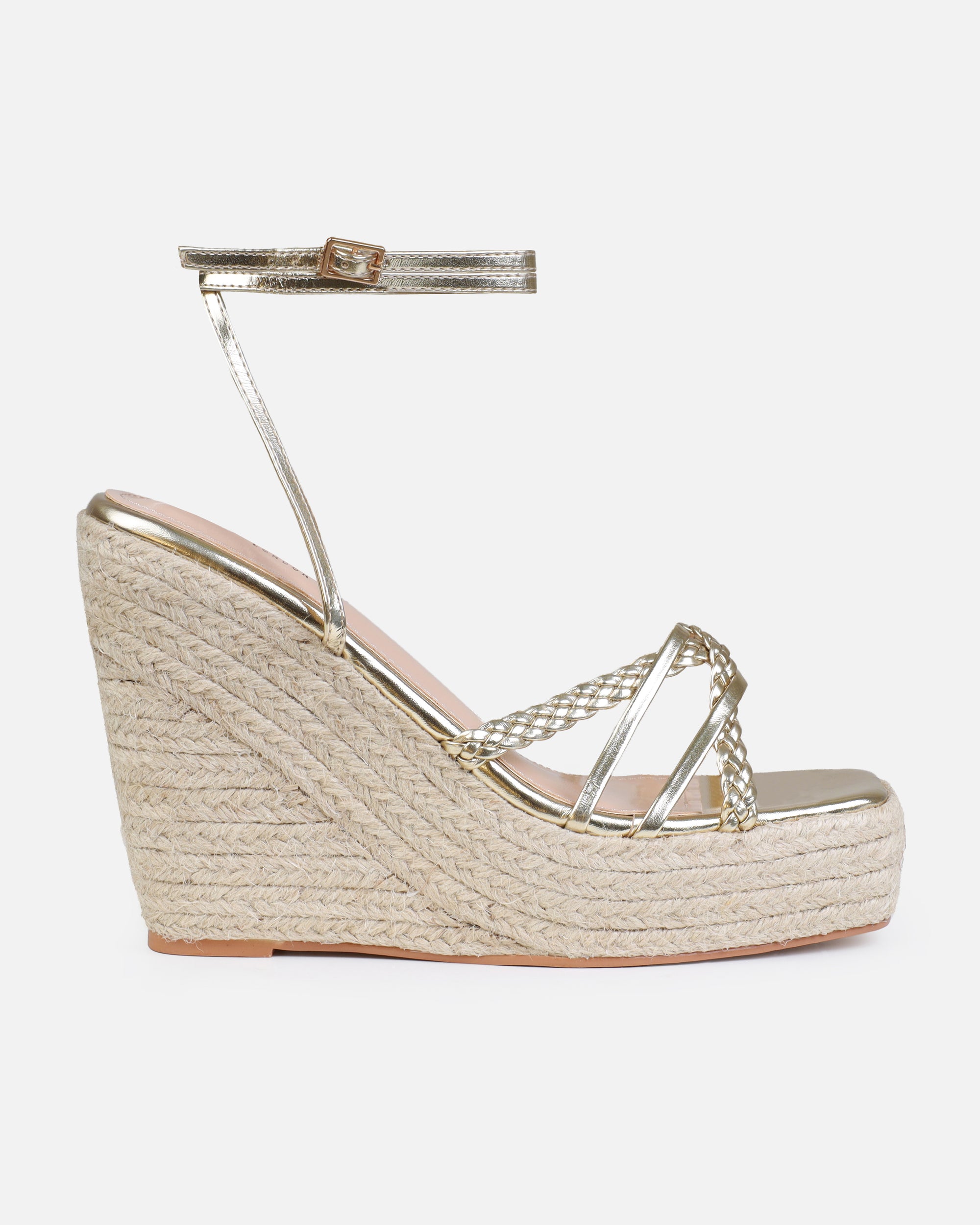 Gold Braided Strappy Espadrille Wedges