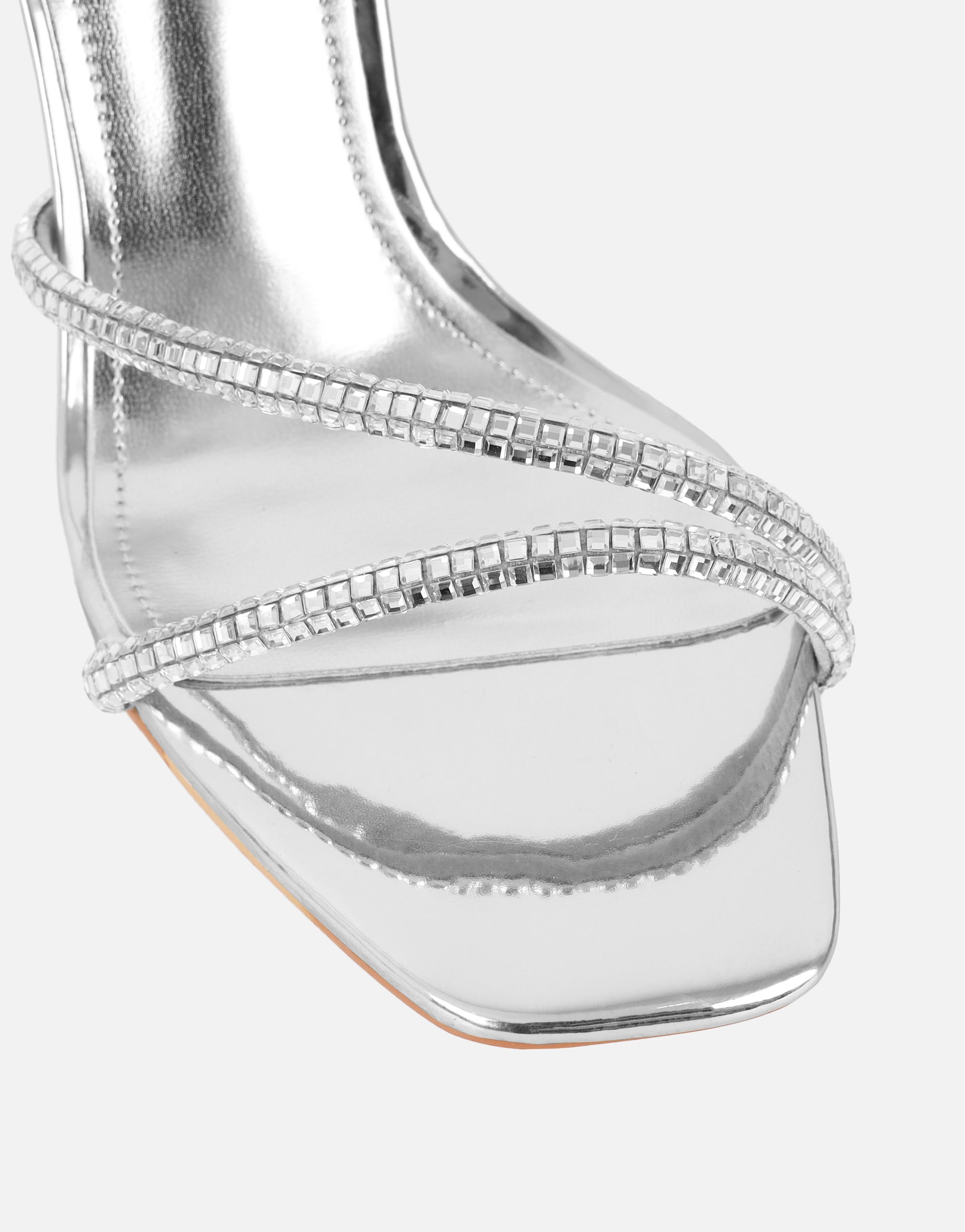 Shine with every step in these stunning mirror-diamanté heeled sandals. Featuring a bold square toe, sparkling diamanté straps, and a secure ankle strap, they’re designed to dazzle from day to night. The perfect statement shoe for girls who love a little extra glam!