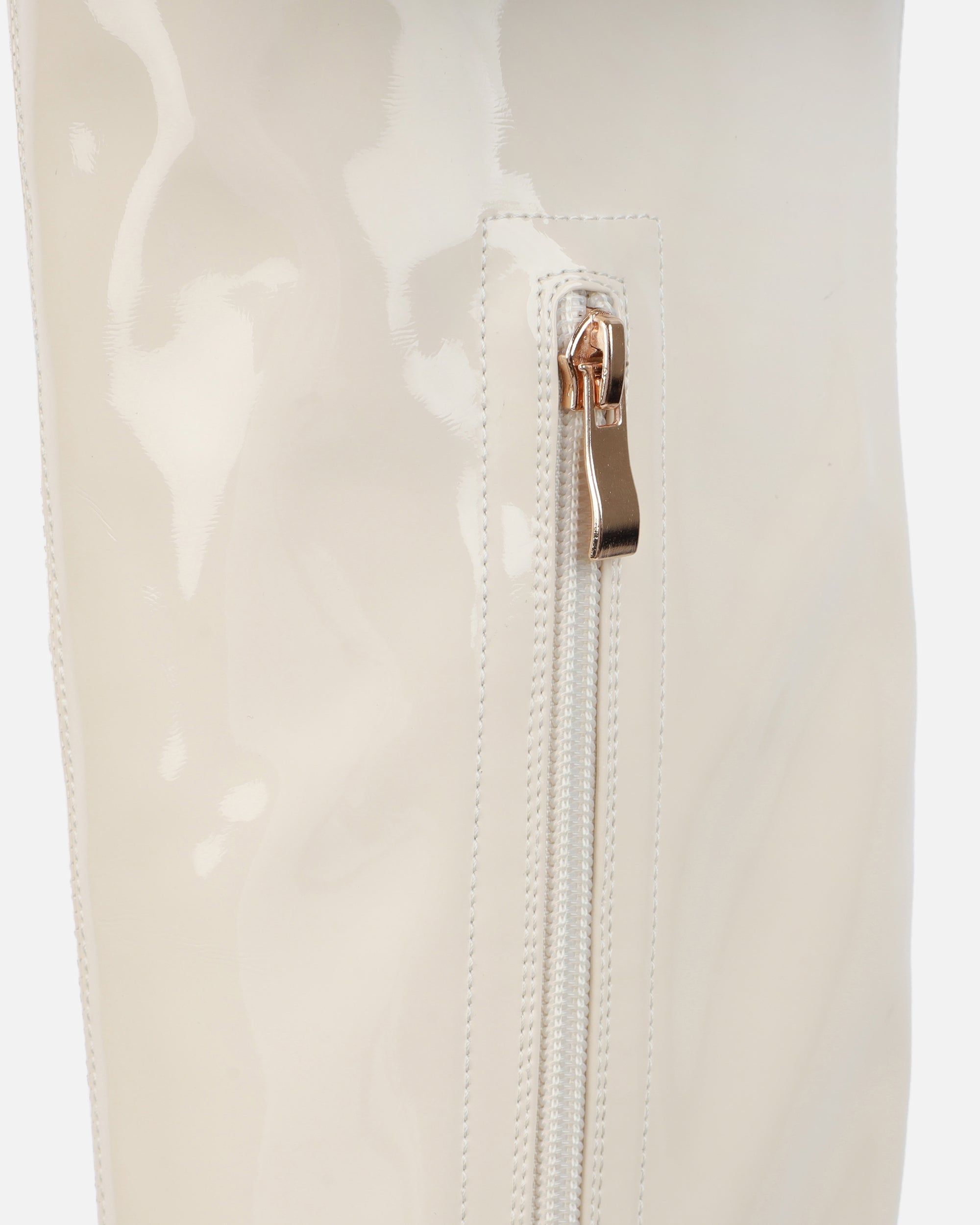 Make these stone patent stretch over the knee boots yours! Featuring a stiletto heel and a pointed toe. Pair our stone patent stretch over the knee boots with a sleek black dress and a statement belt for a night out.