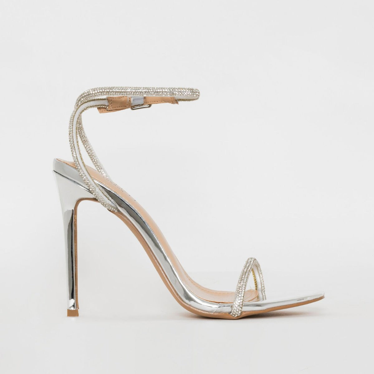 the perfect heel for party season. featuring diamante straps, square toe, toe loop and statement stiletto heel. wear with a white shirt dress and diamanté clutch bag.