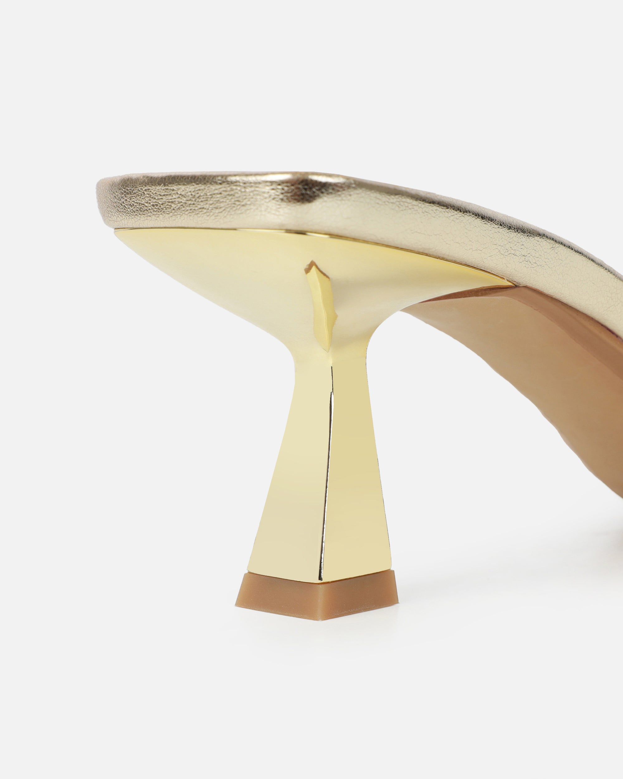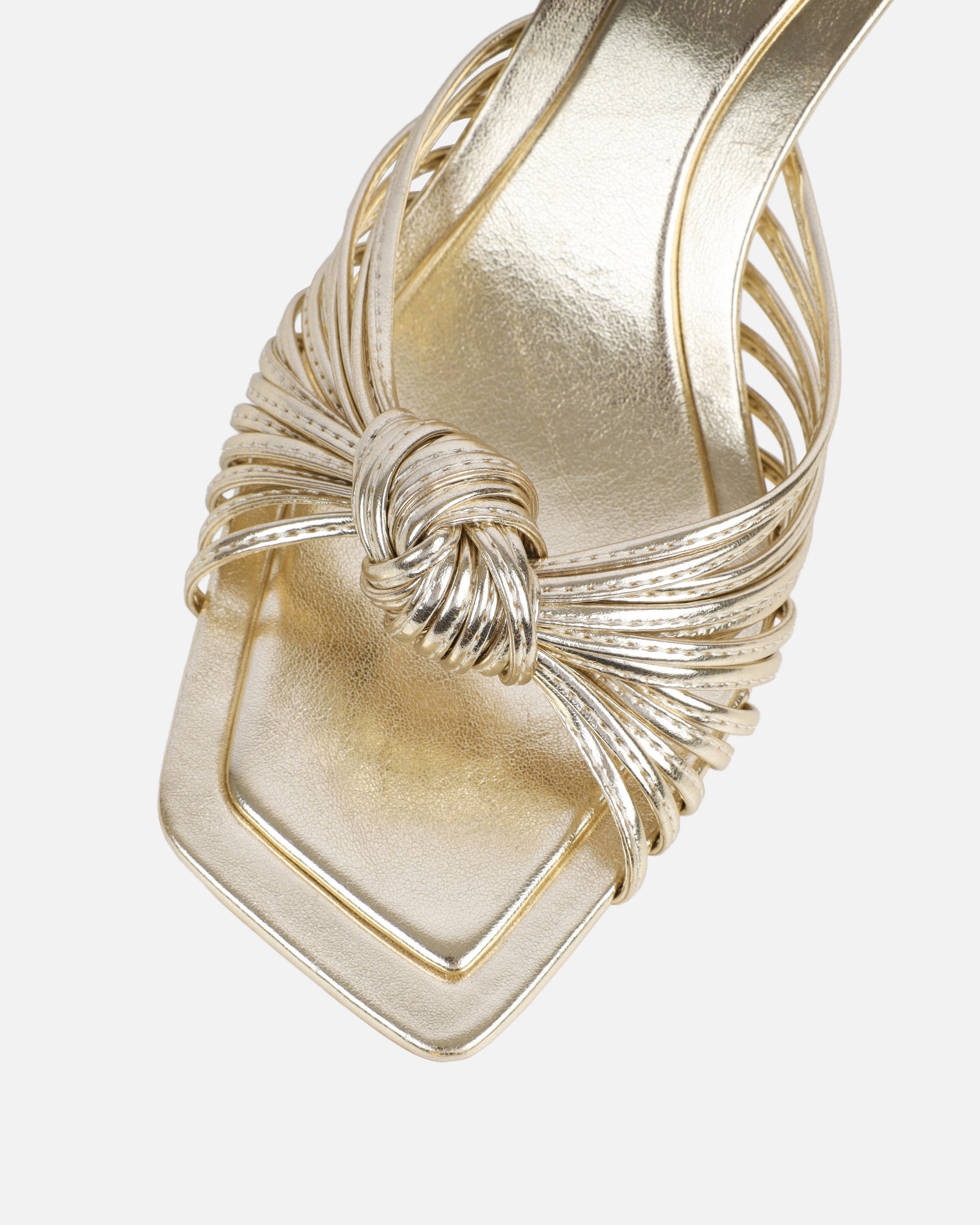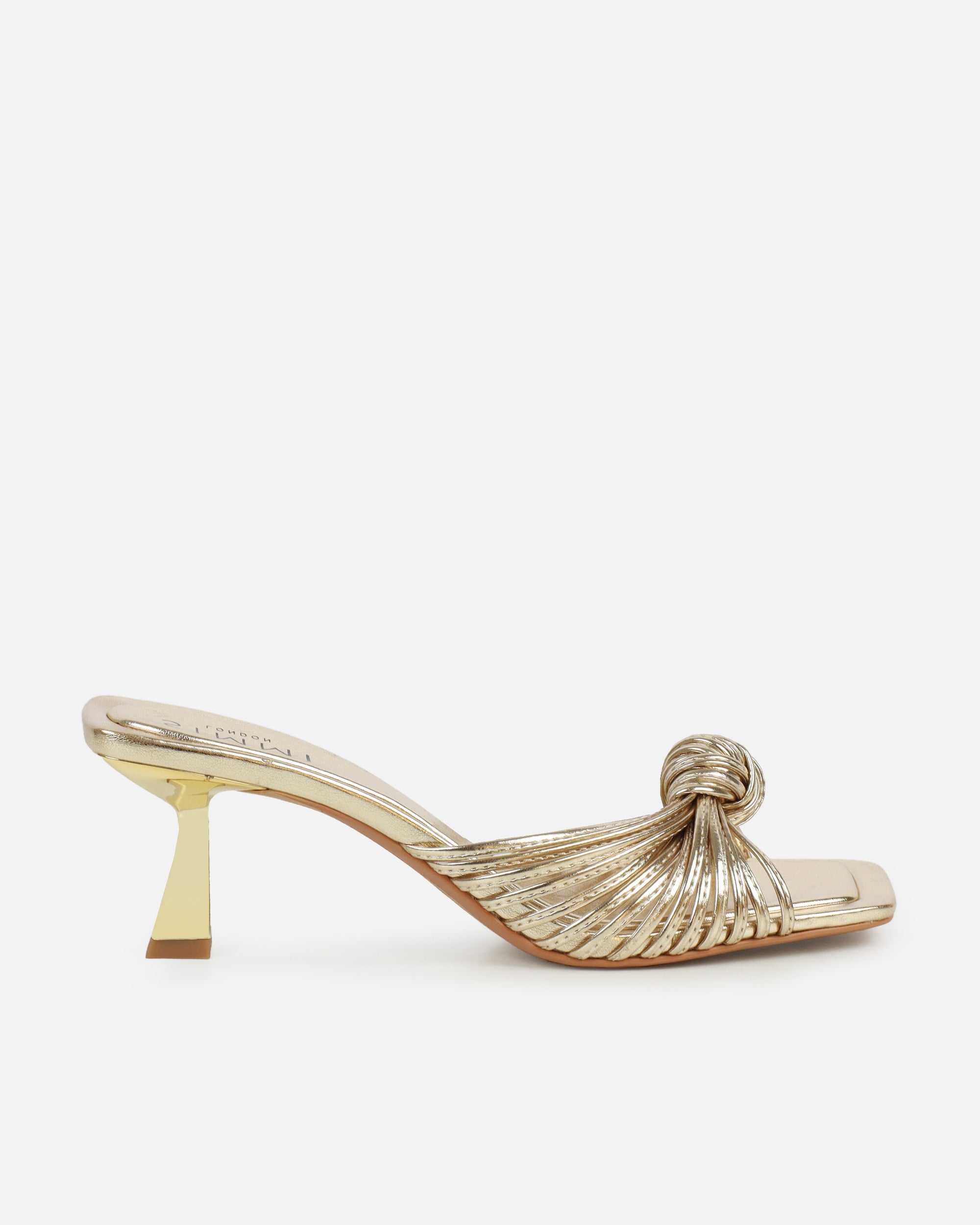 Make a statement with these gold metallic knot detail mules that effortlessly combine comfort and fashion. Featuring a mid heel, square toe and knot detail. These gold metallic knot detail mules are a must-have for those special moments.