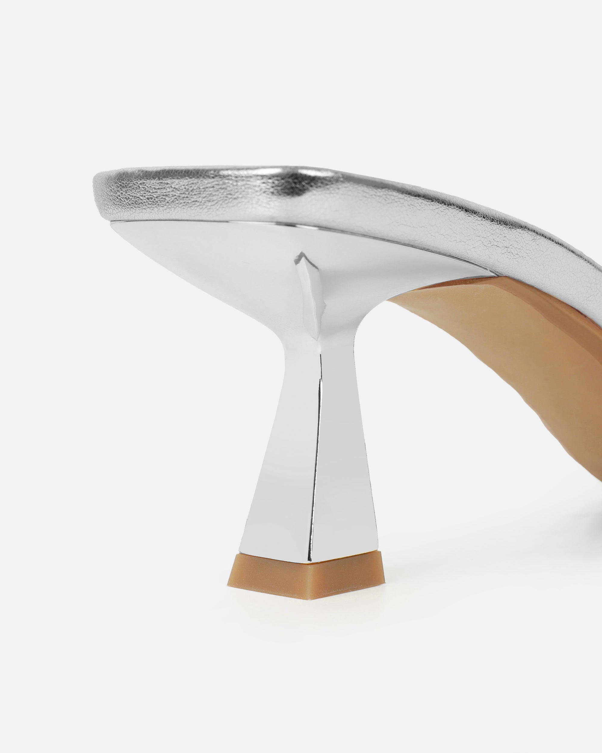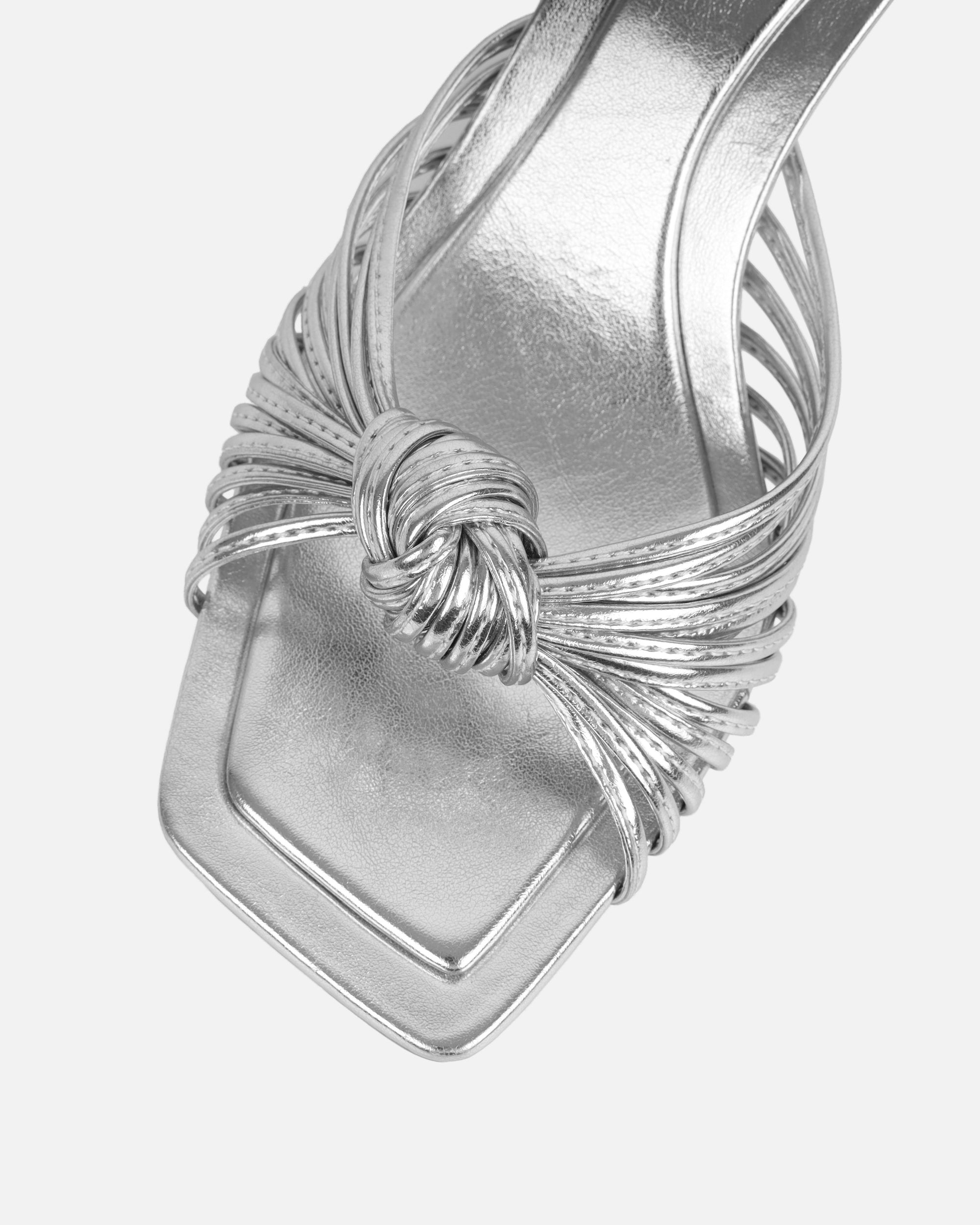Make a statement with these silver metallic knot detail mules that effortlessly combine comfort and fashion. Featuring a mid heel, square toe and knot detail. These silver metallic knot detail mules are a must-have for those special moments.