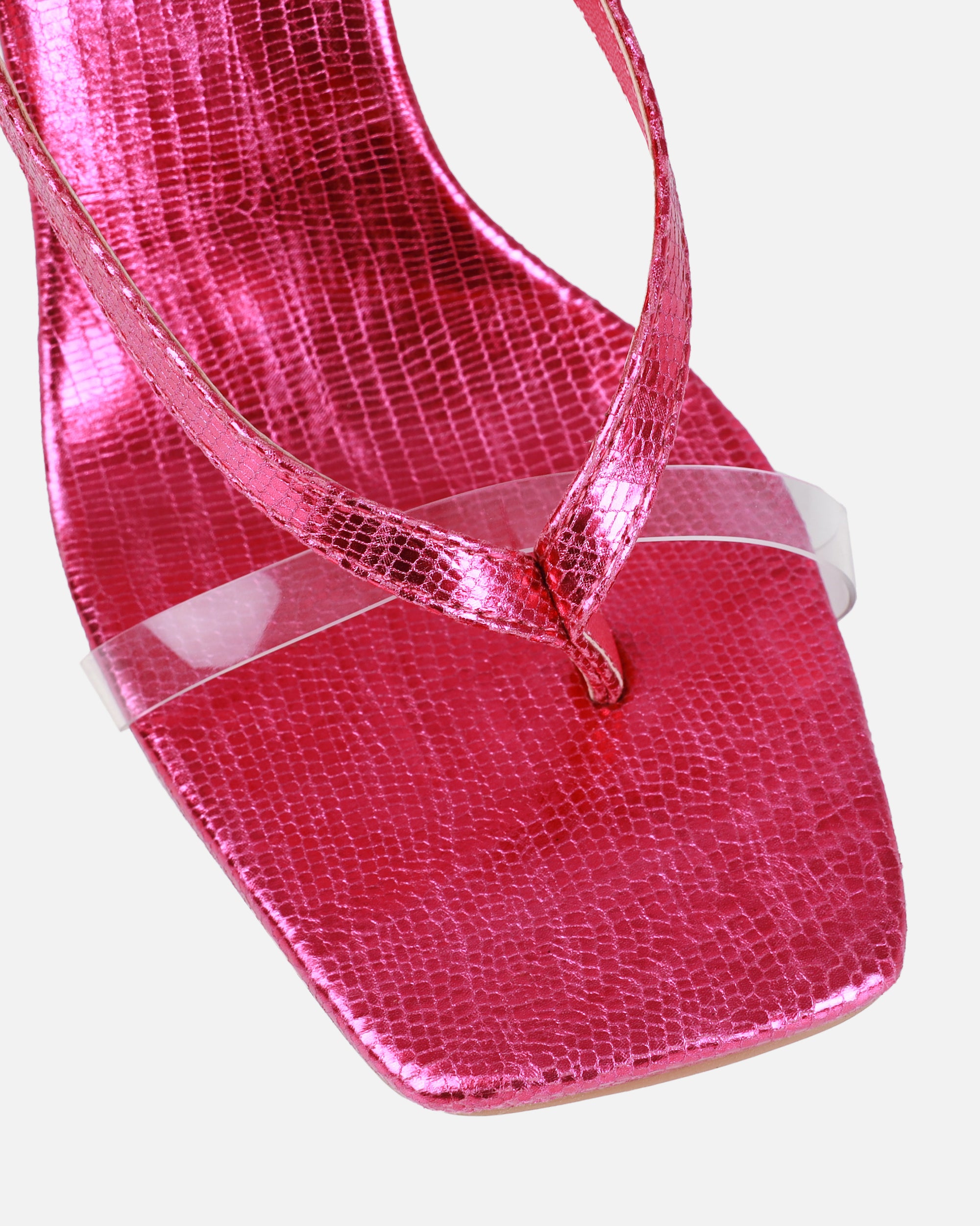 Pink Faux Lizard Print Clear Diamante Toe Thong Heels