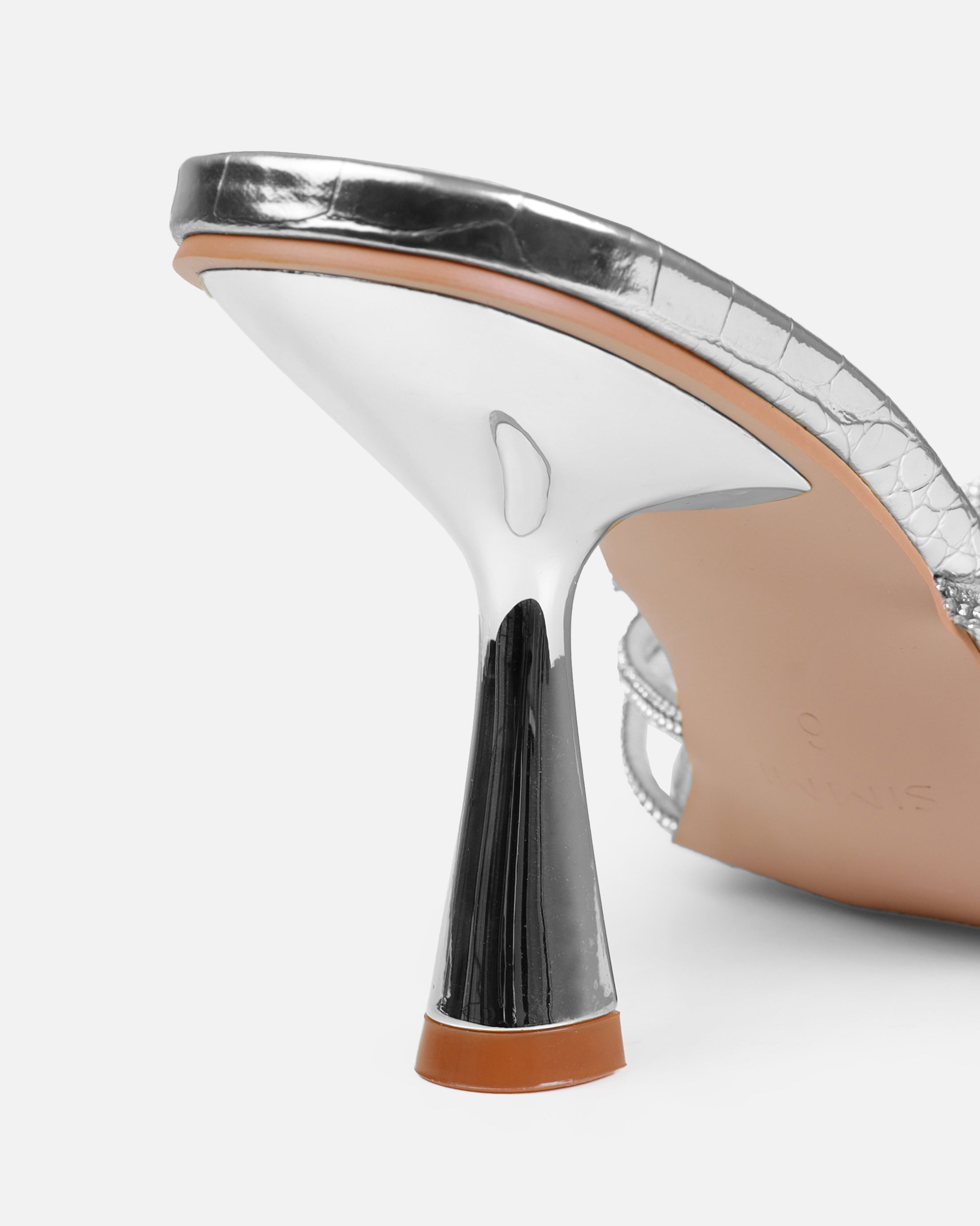 Silver Faux Snake Print Diamante Mid Heel Mules