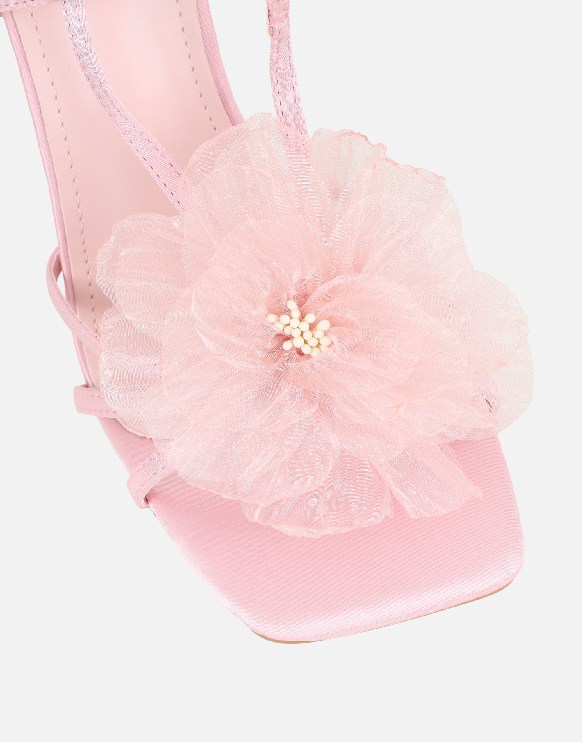 Pink Satin Mesh Flower Heeled Sandals