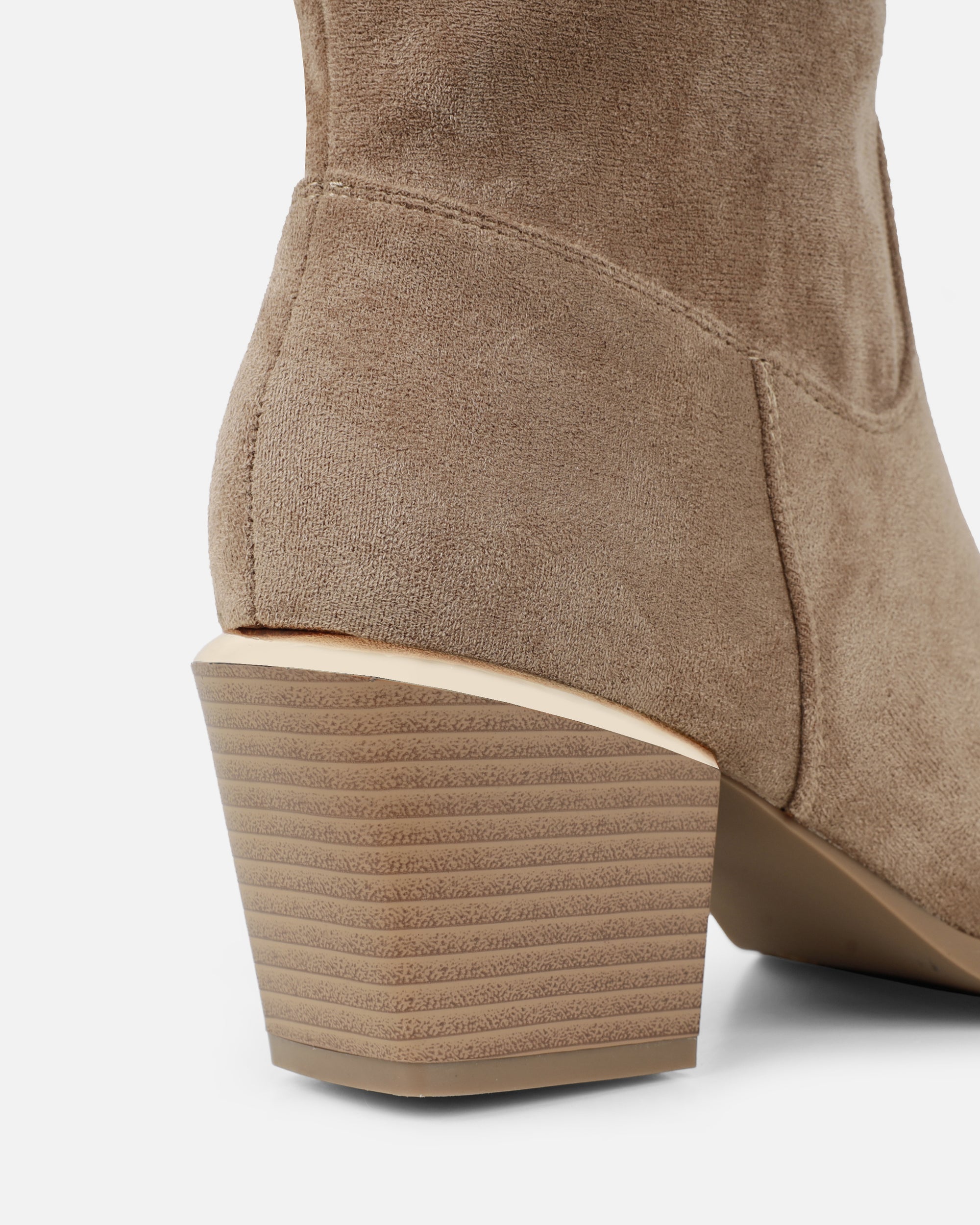 These faux suede calf western boots are bang on trend! Featuring a mid block heel, a pointed toe and side tab detail. Match your faux suede calf western boots with tailored shorts or a long skirt.