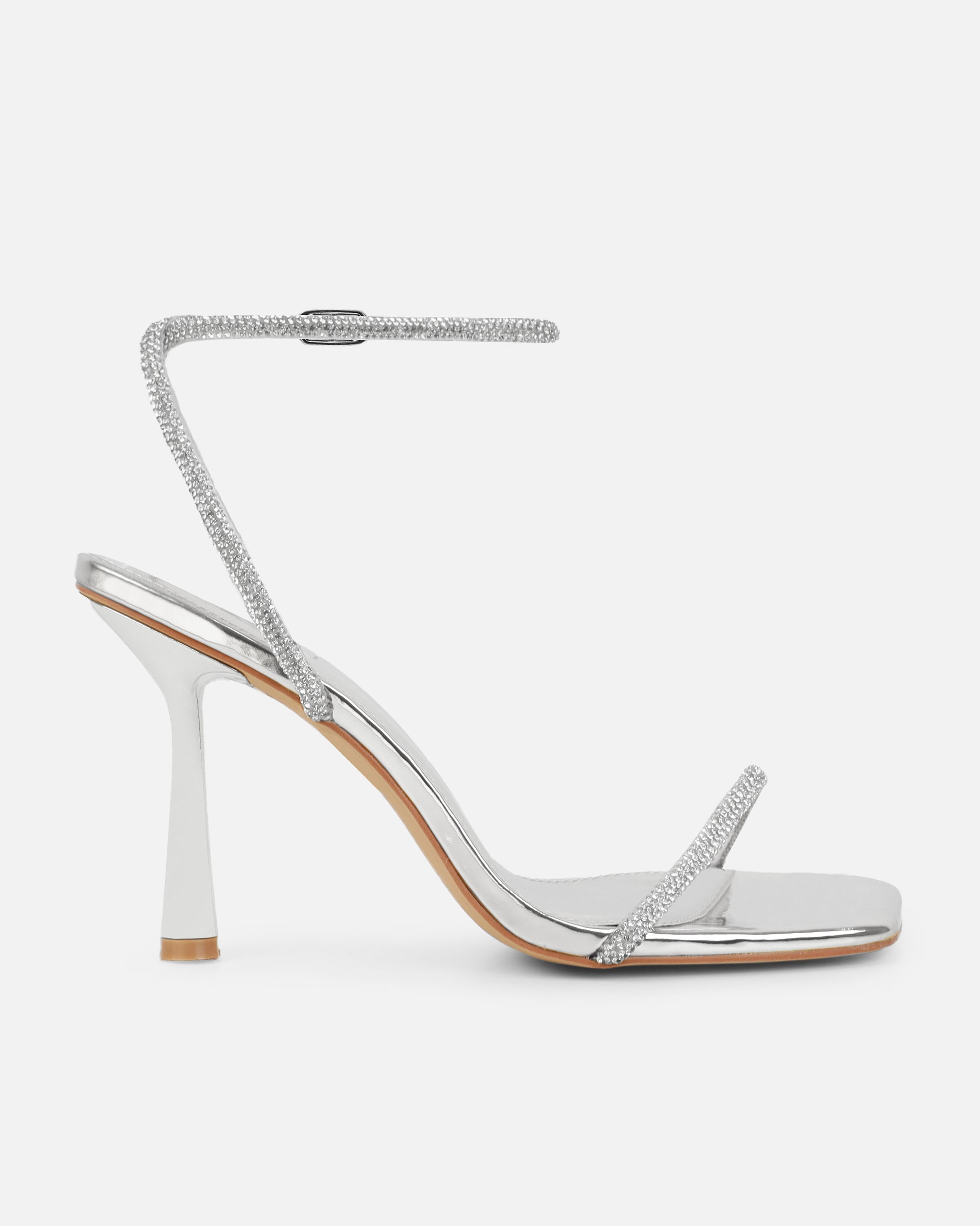We're loving these silver mirror diamante heeled sandals. Featuring a square toe, diamante front strap, an ankle buckle strap and a flared heel. Wear these silver mirror diamante heeled sandals on your next dressy occasion.
