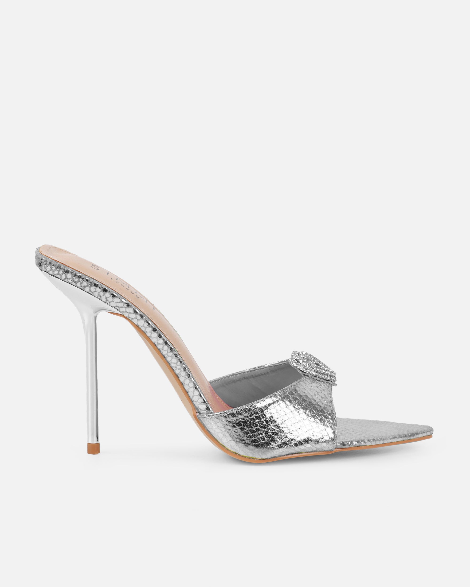 Silver Metallic Snake Heart Diamante Mules