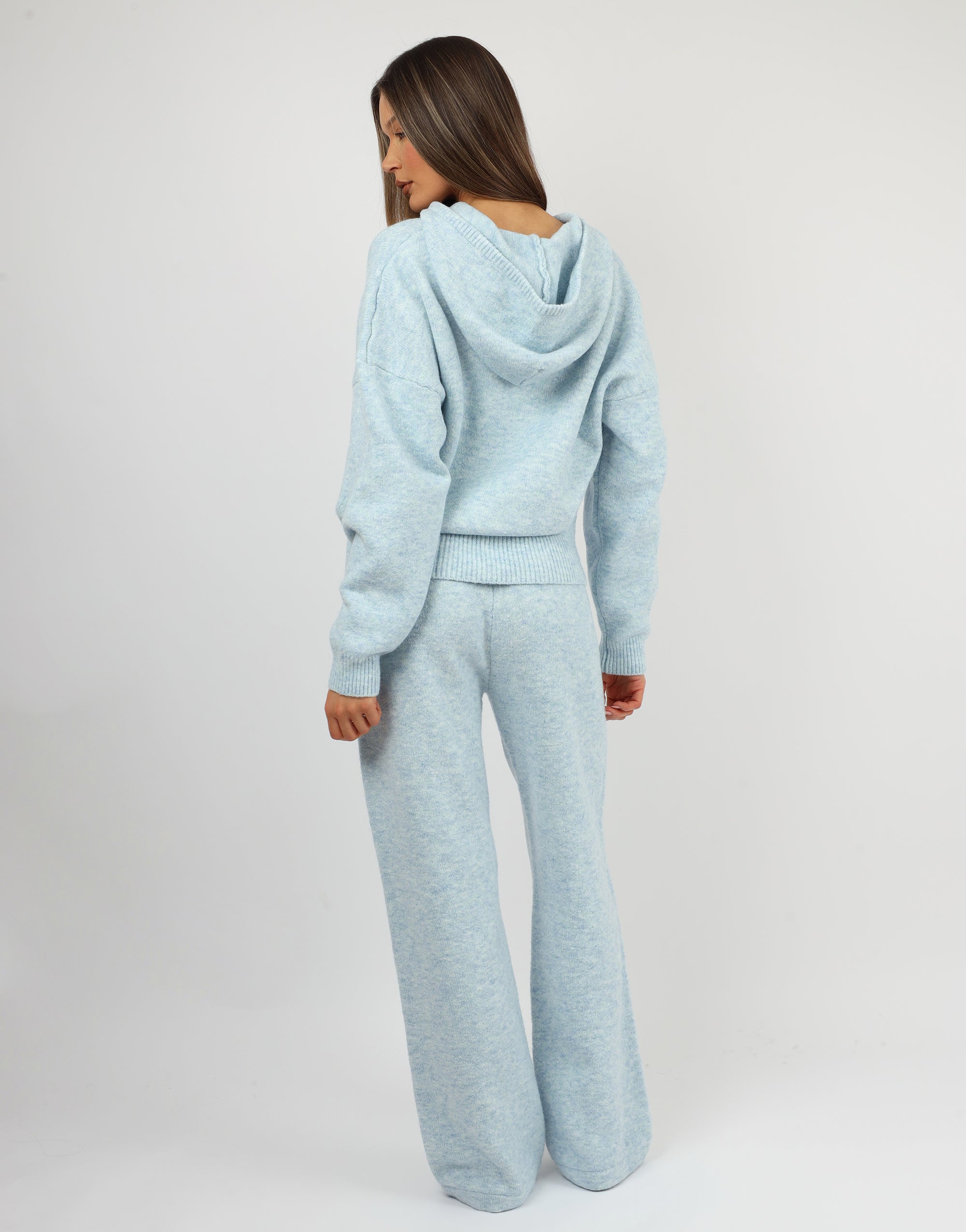 Designed for warmth and effortless style, this super soft, ribbed knit features a zip front and a roomy hood, making it perfect for crisp days, coffee runs, and layering up in style. Pair with the matching wide leg trousers for the full cozy look.