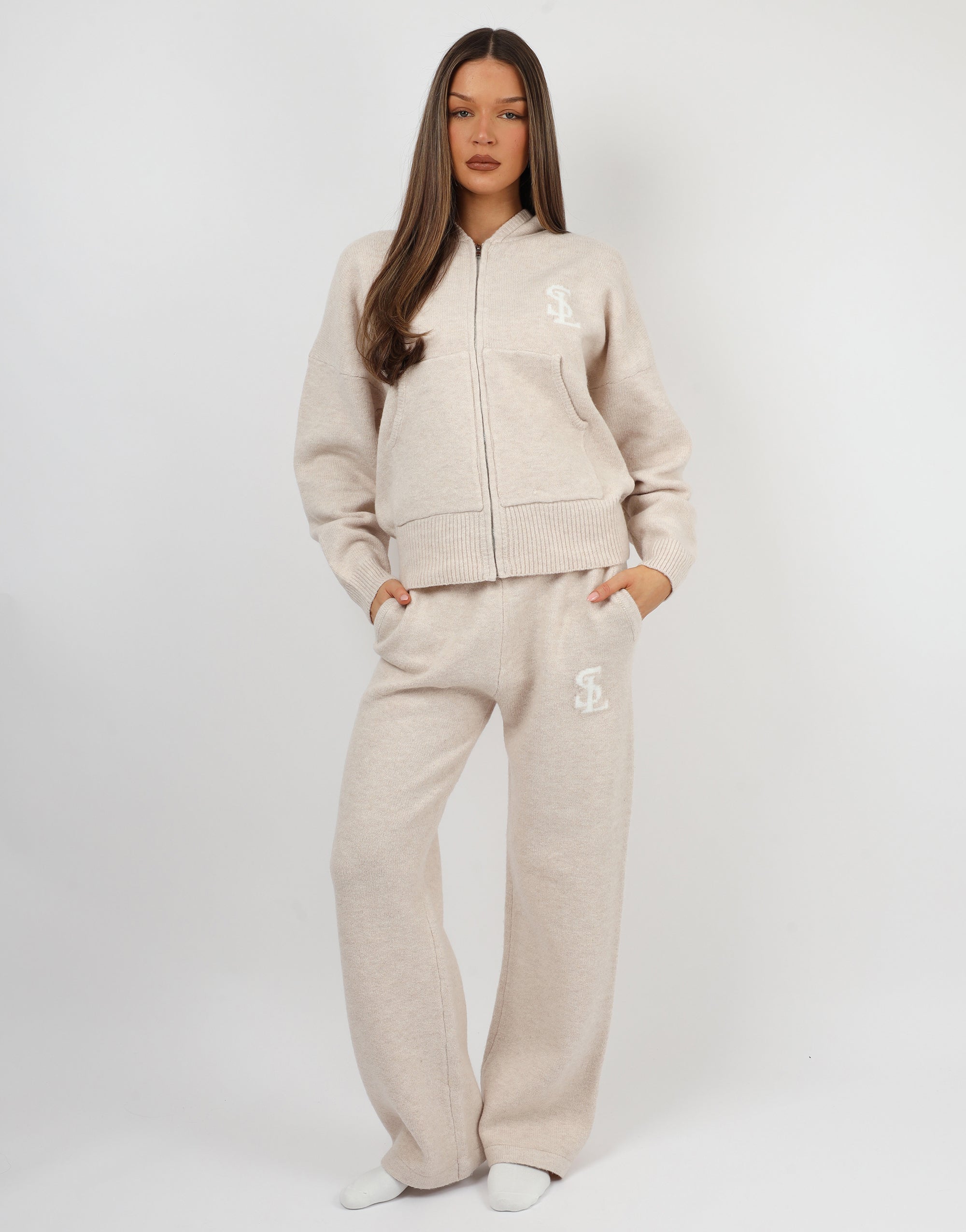 Designed for warmth and effortless style, this super soft, ribbed knit features a zip front and a roomy hood, making it perfect for crisp days, coffee runs, and layering up in style. Pair with the matching wide leg trousers for the full cozy look.