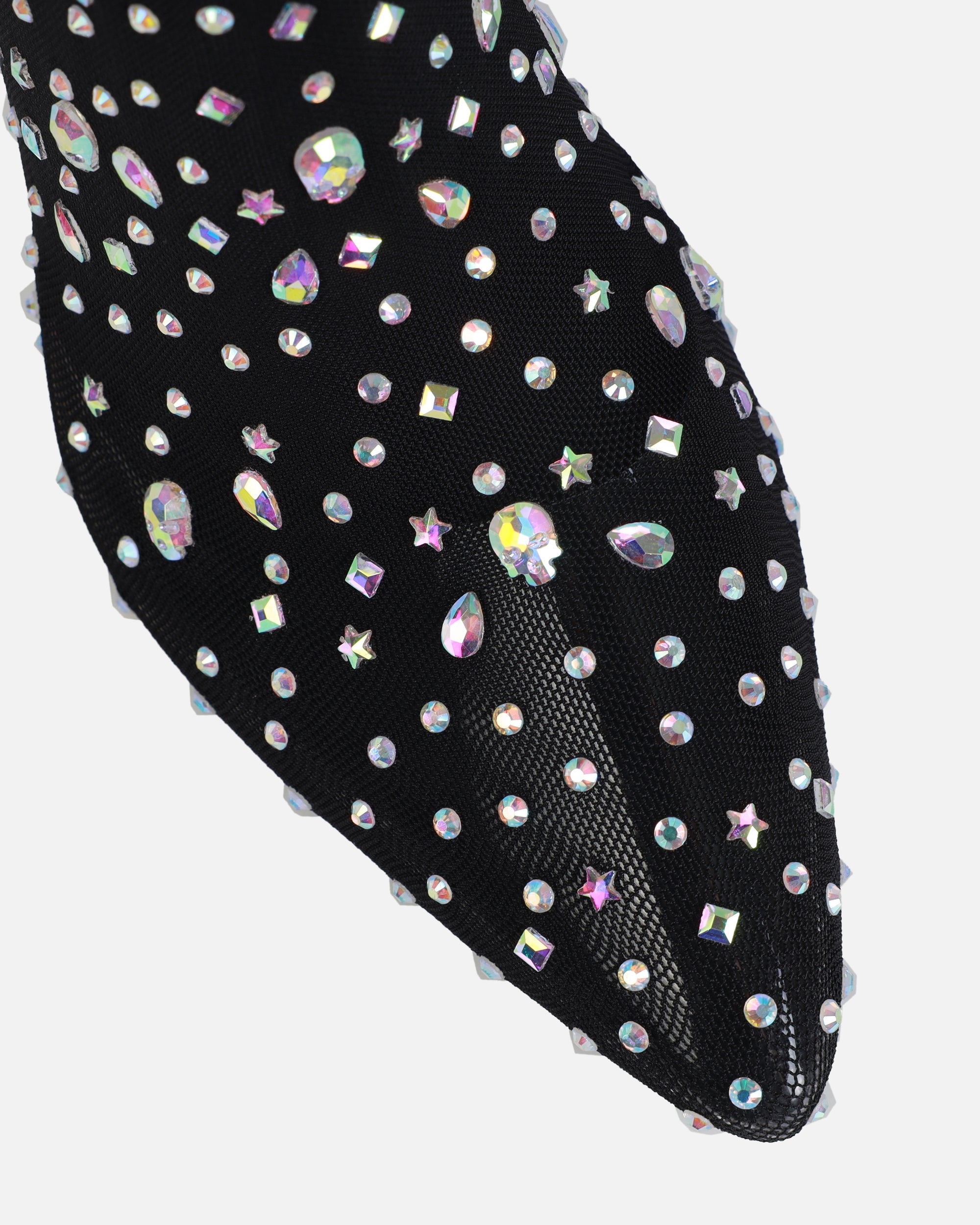 Step out and show up in these mesh diamante heels. Featuring a pointed toe, gem and diamante covered mesh ankle sock and a stiletto heel. Style them up with your fave going out fits.